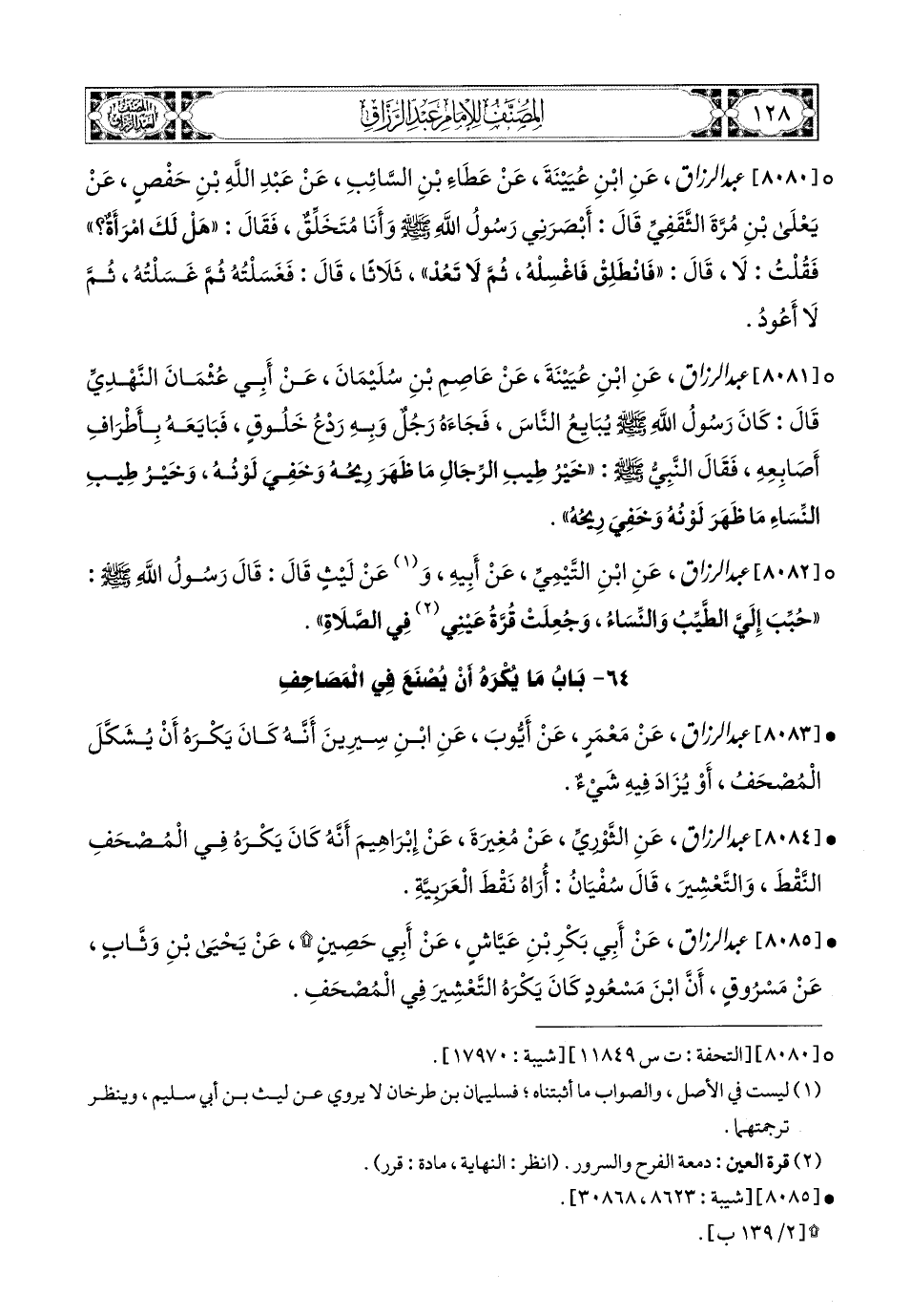 8084- عبد الرزاق، عَنِ الثَّورِيِّ، عَن مُغِيرَةَ، عَن إِبرَاهِيمَ؛ أَنَّهُ كَانَ يَكْرَهُ فِي المُصْحَفِ النَقْطَ، وَالتَّعْشِيرَ.