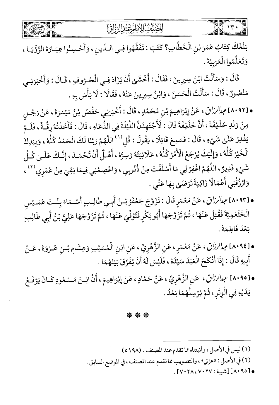 8095- عبد الرزاق، عَنِ الزُّهْرِيِّ، عَن حَمَّادٍ، عَن إِبرَاهِيمَ، أَنَّ ابْنَ مَسْعُودٍ كَانَ يَرْفَعُ يَدَيْهِ فِي الْوِتْرِ، ثُمَّ يُرْسِلْهُمَا بَعْدُ.