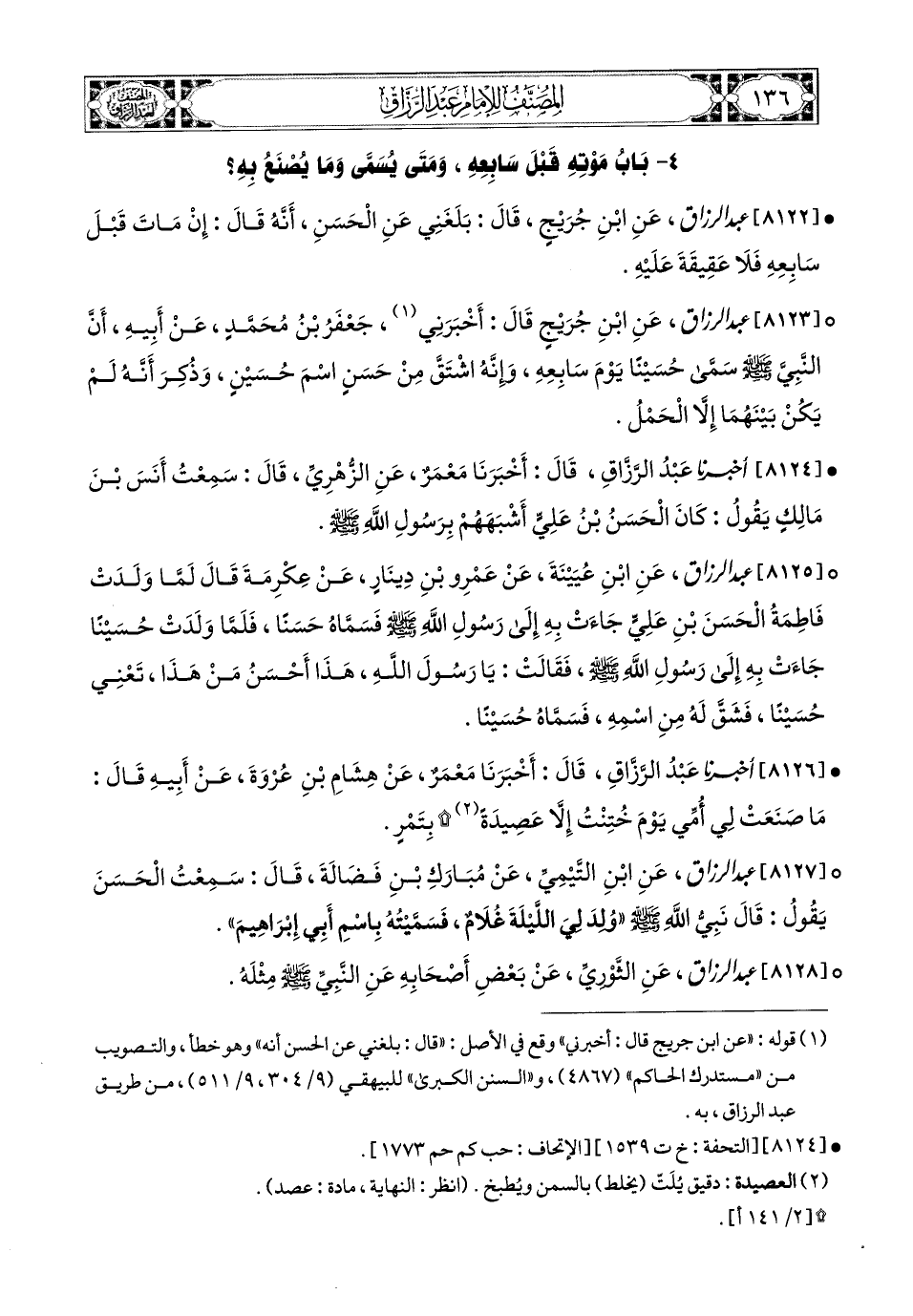 8123 - عبد الرزاق، عَنِ ابْنِ جُرَيْجٍ، قَالَ: أَخْبَرَنِي جَعْفَرُ بن مُحَمَّدٍ، عَنْ أَبِيهِ، أَنَّ النَّبِيَّ صَلَّى اللهُ عَلَيْهِ وَسَلَّمَ سَمَّى حُسَيْنًا (1) يَوْمَ سَابِعِهِ، وَأنَّهُ اشْتَقَّ مِنْ حَسَنٍ اسْمَ حُسَيْنٍ، وَذُكِرَ أَنَّهُ لَمْ يَكُنْ بَيْنَهُمَا إِلاَّ الْحَمْلُ.