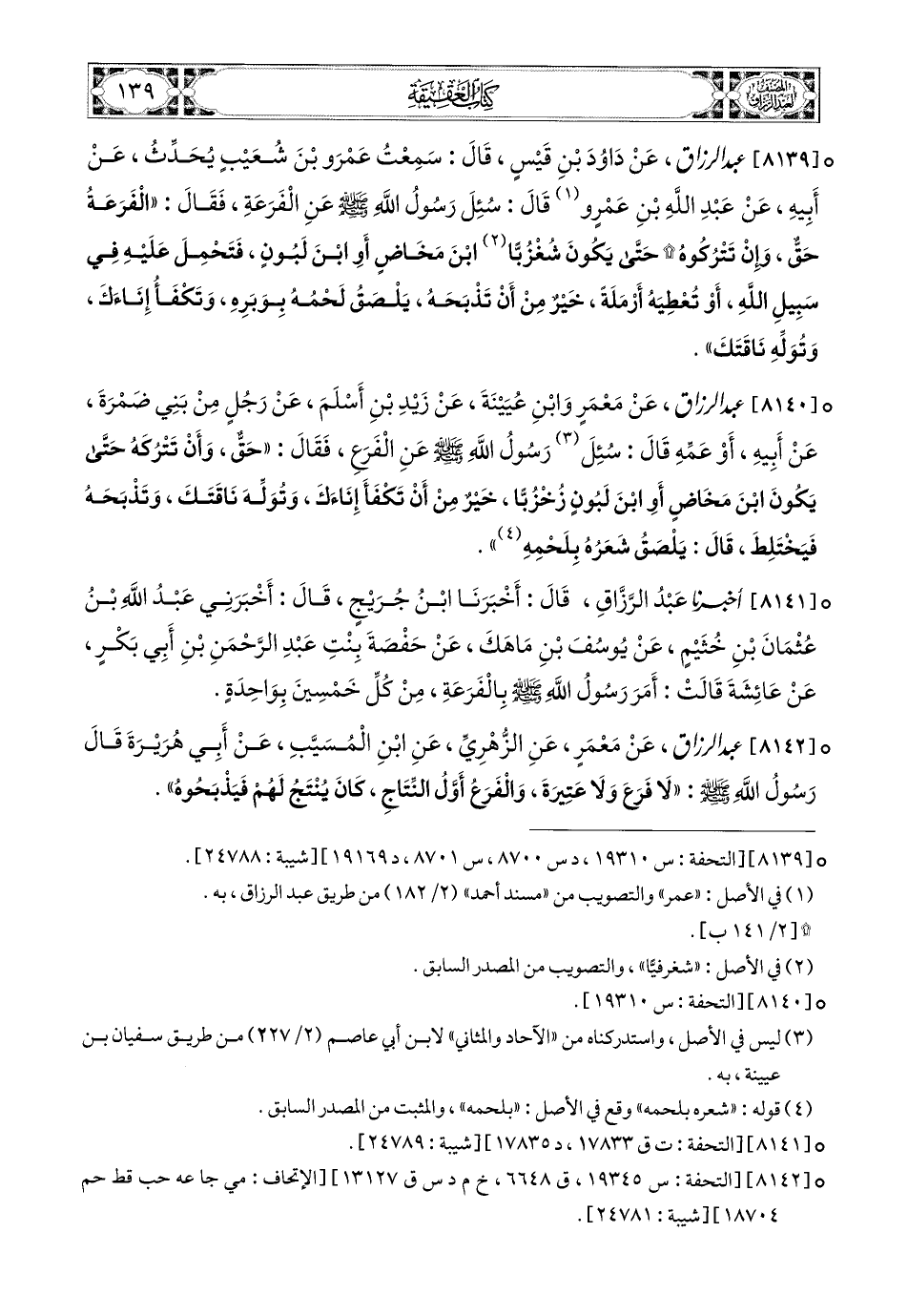 8139 - عبد الرزاق، عَن دَاوُدَ بْنِ قَيْسٍ، قَالَ: سَمِعْتُ عَمْرَو بن شُعَيْبٍ يُحَدِّثُ، عَنْ أَبِيهِ، عَنْ عَبدِ اللهِ بْنِ عَمْرٍو قَالَ: سُئِلَ رَسُولُ اللهِ صَلَّى اللهُ عَلَيْهِ وَسَلَّمَ عَنِ الْفَرَع (1) فَقَالَ: الْفَرَعَة (1) حَقٌّ، وَأَنْ تَتْرُكَوهُ (2) حَتَّى يَكُونَ شُغْزُبًّا (3)، ابْنَ مَخَاضٍ، أَوِ ابْنَ (4) لَبُونٍ، فَتَحْمِلَ عَلَيْهِ فِي سَبِيلِ اللهِ، أَوْ تُعْطِيَهُ أَرْمَلَةً خَيْرٌ مِنْ أَنْ تَذْبَحَهُ يَلْصَقُ لَحْمُهُ بِوَبَرِهِ، وَتَكْفَأُ إِنَاءَكَ، وَتُولِهُ نَاقَتَكَ (5).