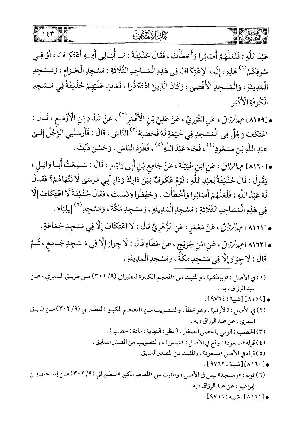 8160- عبد الرزاق، عَنِ ابْنِ عُيَيْنَةَ، عَن جَامِعِ بْنِ أَبِي رَاشِدٍ، قَالَ: سَمِعْتُ أَبَا وَائِلٍ يَقُولُ: قَالَ حُذَيْفَةُ لِعَبْدِ اللهِ: قَوْمٌ عُكُوفٌ بَيْنَ دَارِكَ وَدَارِ أَبِي مُوسَى، لاَ تَنْهَاهُمْ؟ فَقَالَ لَهُ عَبدُ اللهِ: فَلَعَلَّهُمْ أَصَابُوا، وَأَخْطَأْتَ، وَحَفِظُوا، وَنَسِيتَ، فَقَالَ حُذَيْفَةُ: لاَ اعْتِكَافَ إِلاَّ فِي هَذِهِ المَسَاجِدِ الثَّلاَثَةِ: مَسْجِدِ المَدِينَةِ، وَمَسْجِدِ مَكَّةَ، وَمَسْجِدِ إِيلِيَاءَ.