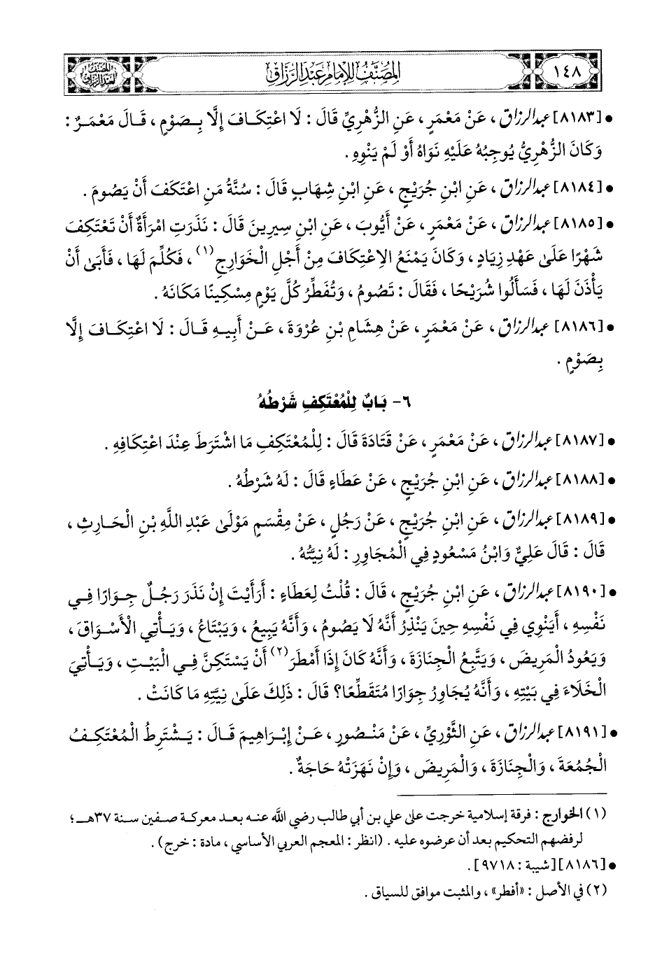 8183- عبد الرزاق، عَنْ مَعْمَرٍ، عَنِ الزُّهْرِيِّ، قَالَ: لاَ اعْتِكَافَ إِلاَّ بِصَوْمٍ.