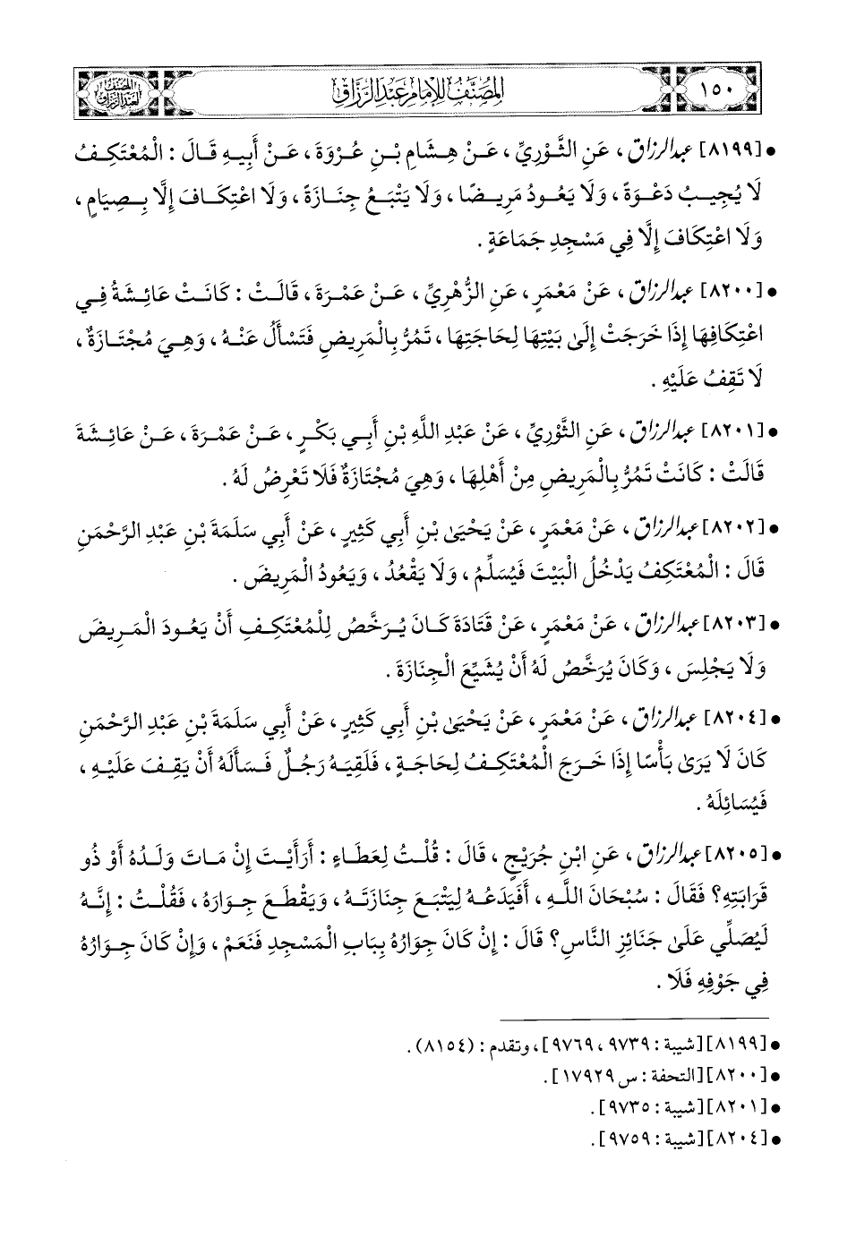 8202- عبد الرزاق، عَنْ مَعْمَرٍ، عَن يَحيَى بنِ أَبِي كَثِيرٍ، عَنْ أَبِي سَلَمَةَ بْنِ عَبدِ الرَّحْمَنِ قَالَ: المُعْتَكِفُ يَدْخُلُ الْبَيْتَ فَيُسَلِّمُ، وَلاَ يَقْعُدُ، وَيَعُودُ المَرِيضَ.