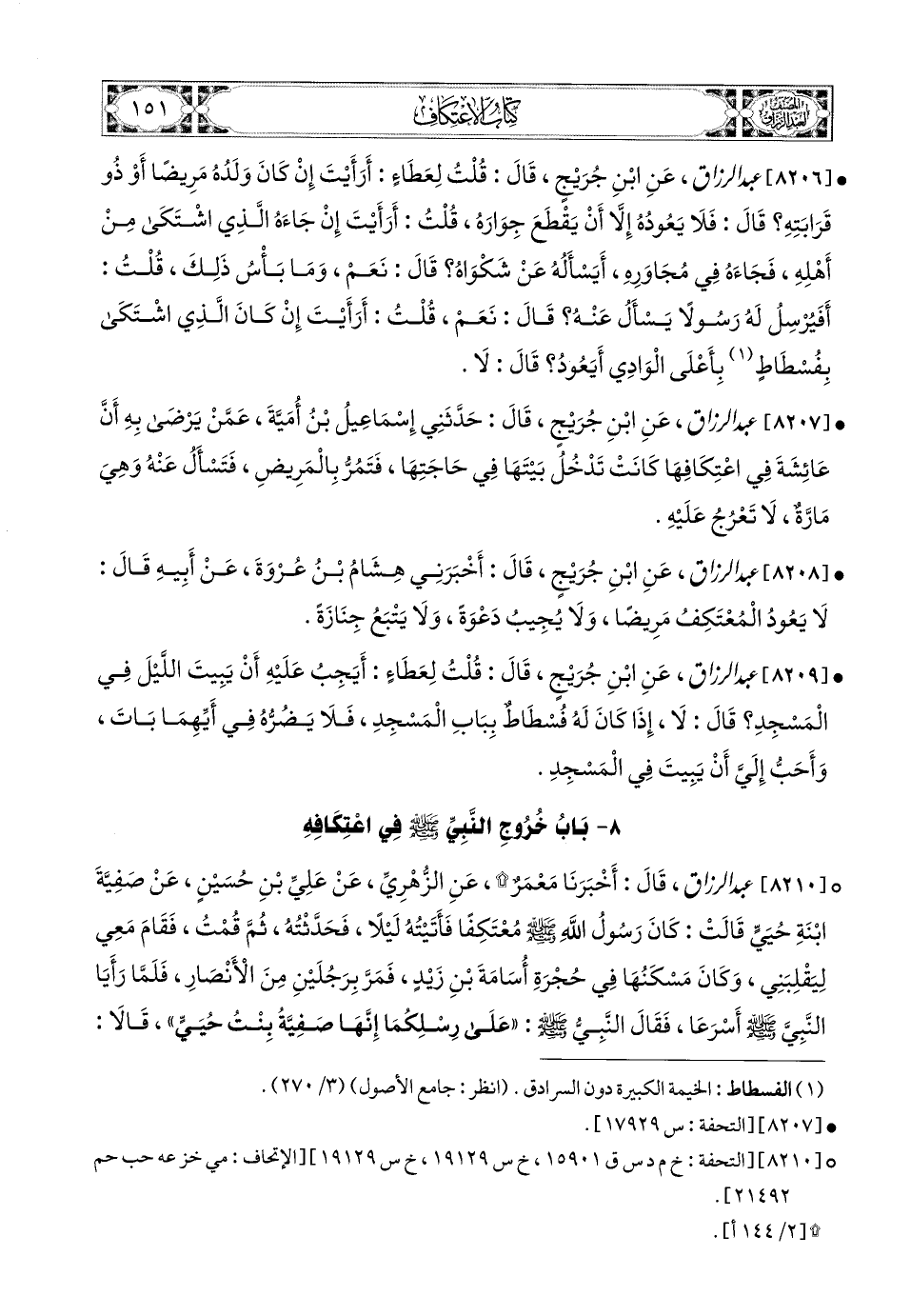 8207- عبد الرزاق، عَنِ ابْنِ جُرَيْجٍ، قَالَ: حَدَّثَنِي إِسْمَاعِيلُ بن أُمَيَّةَ، عَمَّنْ يَرْضَى بِهِ، أَنَّ عَائِشَةَ فِي اعْتِكَافِهَا كَانَتْ تَدْخُلُ بَيْتَهَا فِي حَاجَتِهَا، فَتَمُرُّ بِالمَرِيضِ، فَتَسْأَلُ عَنْهُ، وَهِيَ مَارَّةٌ، لاَ تُعَرِّجُ عَلَيْهِ.