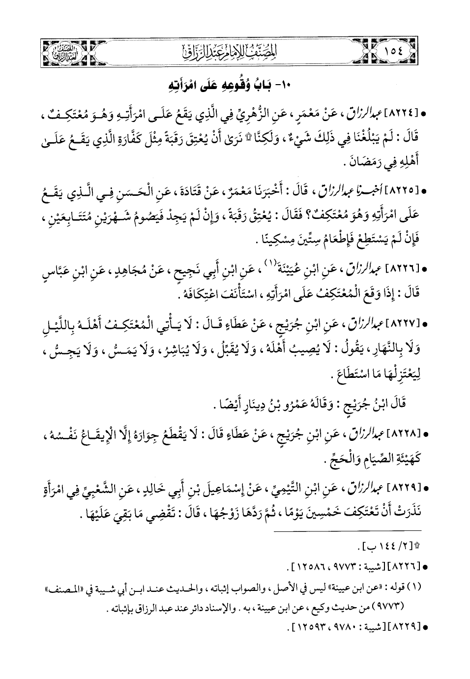 8226- عبد الرزاق، عَنِ ابن عيينة، عَنِ ابْنِ أَبِي نَجِيحٍ، عَن مُجاهِدٍ، عَنِ ابْنِ عَبَّاسٍ، قَالَ: إِذَا وَقَعَ المُعْتَكِفُ عَلَى امْرَأَتِهِ اسْتَأْنَفَ اعْتِكَافَهُ.