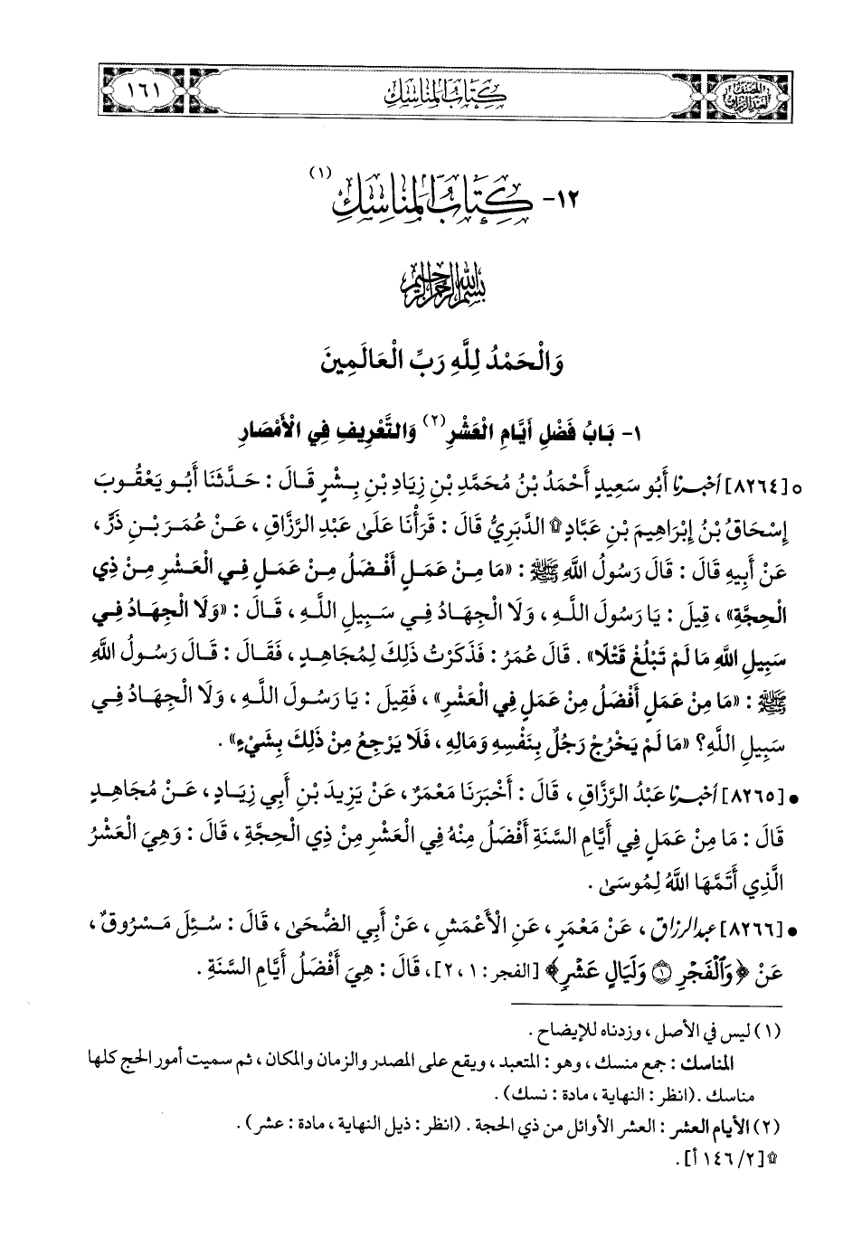 - قَرَأْنَا عَلَى عَبدِ الرَّزَّاقِ، عَن عُمَرَ بْنِ ذَرٍّ، عَنْ أَبِيهِ، قَالَ: قَالَ رَسُولُ اللهِ صَلَّى اللهُ عَلَيْهِ وَسَلَّمَ: مَا مِنْ عَمَلٍ أَفْضَلُ مِنْ عَمَلٍ فِي الْعَشْرِ مِنْ ذِي الْحِجَّةِ، قِيلَ: يَا رَسُولَ اللهِ، وَلاَ الْجِهَادُ فِي سَبِيلِ اللهِ؟ قَالَ: وَلاَ الْجِهَادُ فِي سَبِيلِ اللهِ، مَا لَمْ تَبْلُغْ قَتْلاً.