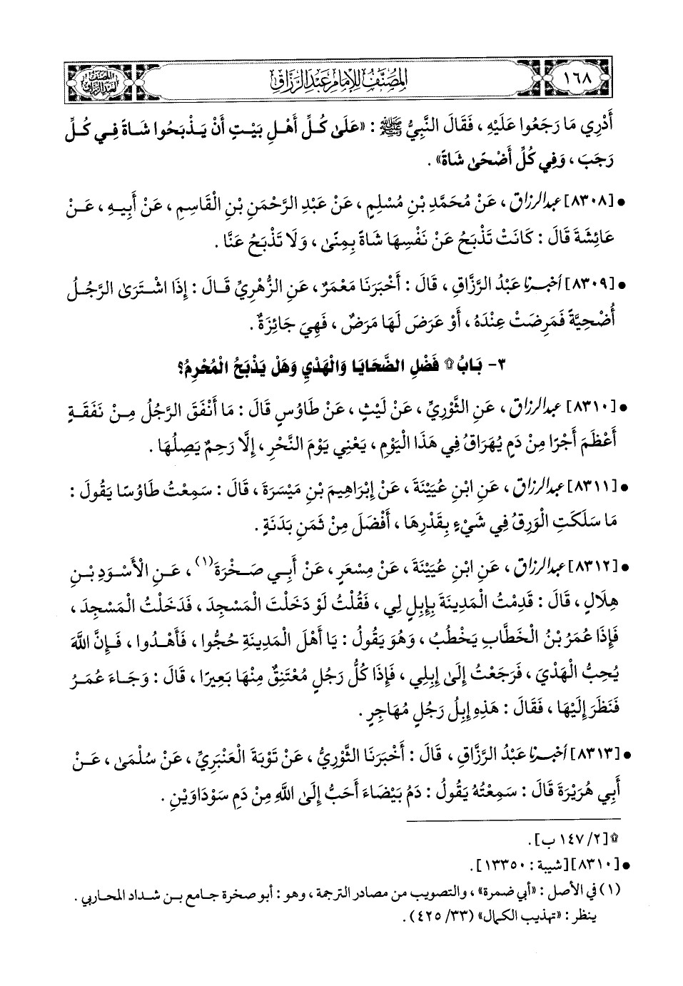 8312- عبد الرزاق، عَنِ ابْنِ عُيَيْنَةَ، عَن مِسْعَرٍ، عَنْ أَبِي صَخْرَةَ، عَنِ الأَسْوَدِ بْنِ هِلاَلٍ قَالَ: قَدِمْتُ المَدِينَةَ بِإِبِلٍ لِي، فَقُلْتُ: لَوْ دَخَلْتُ المَسْجِدَ، قَالَ: فَدَخَلْتُ المَسْجِدَ، فَإِذَا عُمَرُ بن الْخَطَّابِ يَخْطُبُ وَهُوَ يَقُولُ: يَا أَهْلَ المَدِينَةِ، حُجُّوا فَأَهْدُوا، فَإِنَّ اللهَ يُحِبُّ الْهَدْيَ، فَرَجَعْتُ إِلَى إِبِلِي، فَإِذَا كُلُّ رَجُلٍ مَعْتَنِقٌ مِنْهَا بَعِيرًا، قَالَ: وَجَاءَ عُمَرُ فَنَظَرَ إِلَيْهَا، فَقَالَ: هَذِهِ إِبِلُ رَجُلٍ مُهَاجِرٍ.