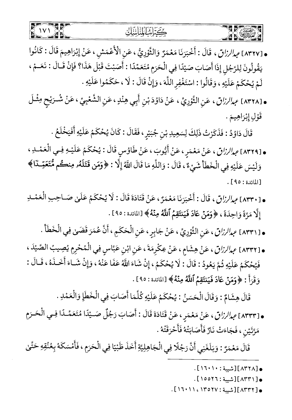 8329- عبد الرزاق، عَنْ مَعْمَرٍ، عَنْ أَيُّوبَ، عَن طَاوُوسٍ، قَالَ: يُحْكَمُ عَلَيْهِ فِي الْعَمْدِ، وَلَيْسَ عَلَيْهِ فِي الْخَطَإِ شَيْءٌ، قَالَ: وَاللهِ مَا قَالَ اللهُ إِلاَّ: {وَمَنْ قَتَلَهُ مِنْكُمْ مُتَعَمِّدًا}.