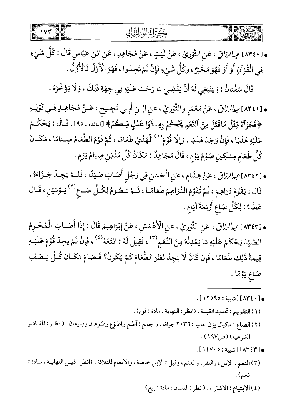 8341- عبد الرزاق، عَنْ مَعْمَرٍ، وَالثَّورِيِّ، عَنِ ابْنِ أَبِي نَجِيحٍ، عَن مُجاهِدٍ، فِي قَوْلِهِ: {فَجَزَاءٌ مِثْلُ مَا قَتَلَ مِنَ النَّعَمِ يَحْكُمُ بِهِ ذَوَا عَدْلٍ مِنْكُمْ} قَالَ: يَحْكُمُ عَلَيْهِ هَدْيًا، فَإِنْ وَجَدَ هَدْيًا، وَإِلاَّ قُوِّمَ الْهَدْيُ طَعَامًا، ثُمَّ قُوِّمَ الطَّعَامُ صِيَامًا، مَكَانُ كُلِّ طَعَامِ مِسْكِينٌ صَوْمُ يَوْمٍ، قَالَ مُجاهِدٌ: مَكَانُ كُلِّ مُدَّيْنٍ صِيَامُ يَوْمٍ.