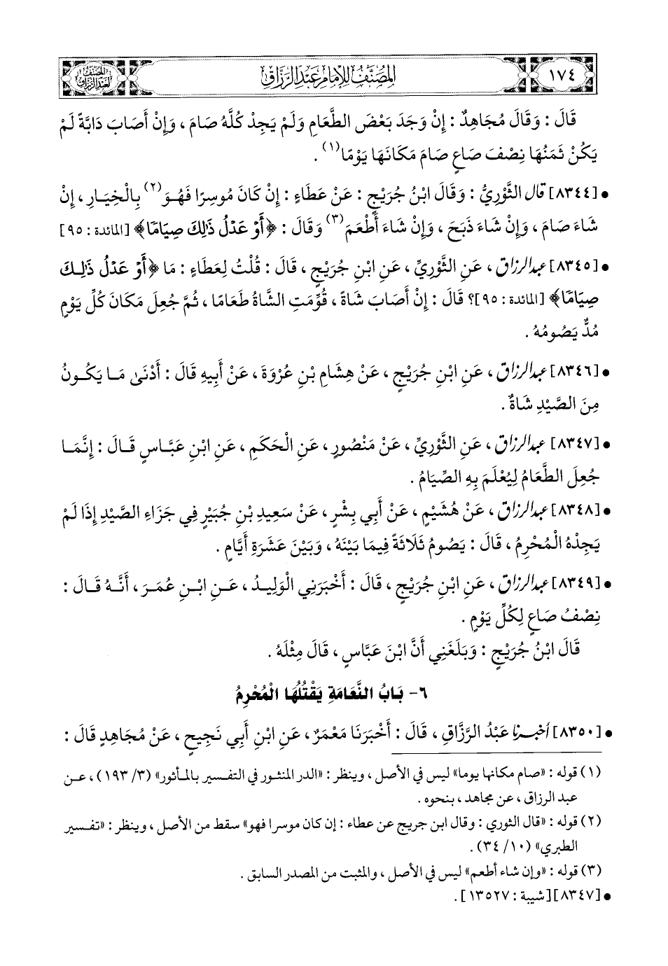 8350- أخبرنا عبد الرزاق، قَالَ: أَخْبَرَنَا مَعْمَرٌ، عَنِ ابْنِ أَبِي نَجِيحٍ، عَن مُجاهِدٍ قَالَ: فِي النَّعَامَةِ بَدَنَةٌ وَفِي حِمَارِ الْوَحْشِ بَقَرَةٌ، وَفِي بَقَرَةِ الْوَحْشِ بَقَرَةٌ، وَفِي الْفَادِرِ الْعَظِيمِ مِنَ الأَرْوَى بَقَرَةٌ، وَفِيمَا دُونَ الأَرْوَى شَاةٌ، وَفِي الْوَبْرِ شَاةٌ.