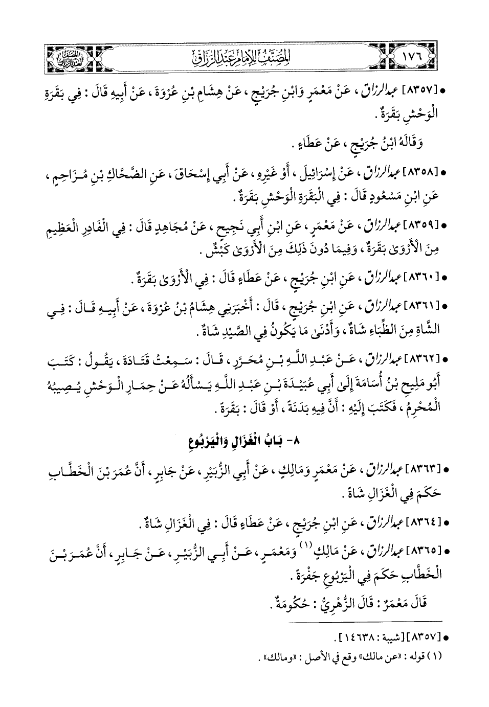 8357- عبد الرزاق، عَنْ مَعْمَرٍ، وَابْنِ جُرَيْجٍ، عَن هِشَامِ بْنِ عُرْوَةَ، عَنْ أَبِيهِ، قَالَ: فِي بَقَرَةِ الْوَحْشِ بَقَرَةٌ.