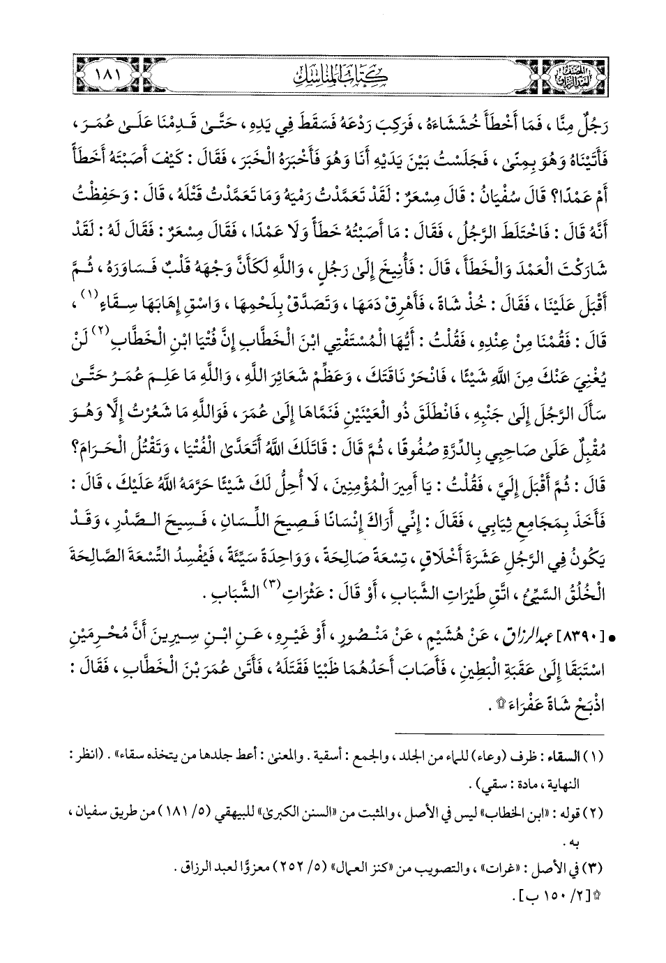8390- عبد الرزاق، عَن هُشَيْمٍ، عَنْ مَنصُورٍ، أَوْ غَيْرِهِ، عَنِ ابْنِ سِيرِينَ، أَنَّ مُحْرِمَيْنِ اسْتَبَقَا إِلَى عَقَبَةِ الْبَطِينِ، فَأصَابَ أَحَدُهُمَا ظَبْيًا، فَقَتَلَهُ، فَأَتَى عُمَرَ بن الْخَطَّابِ، فَقَالَ: اذْبَحْ شَاةً عَفْرَاءَ.