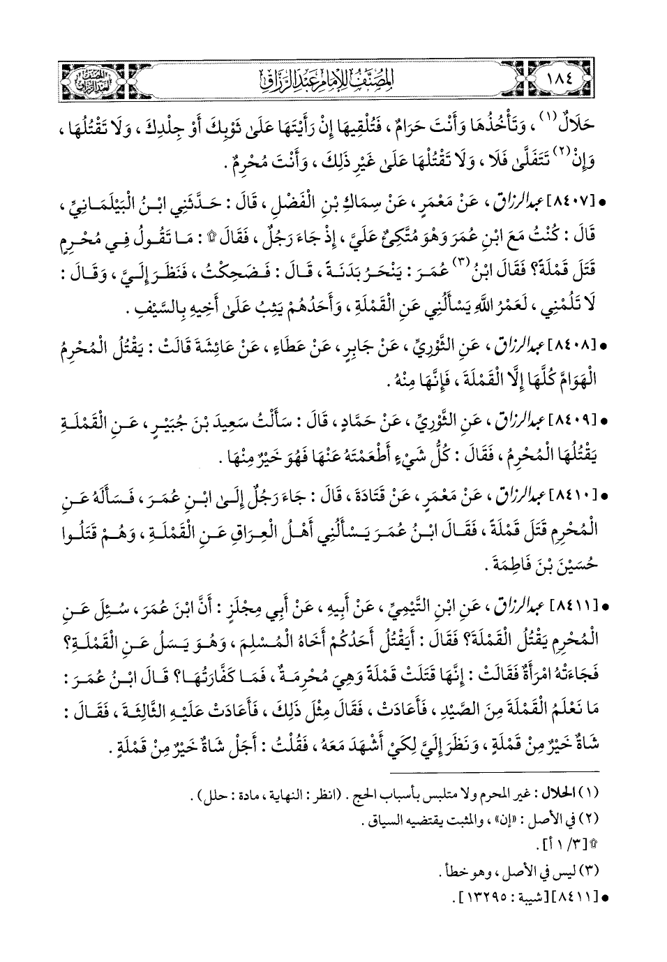 8411- عبد الرزاق، عَنِ ابْنِ التَّيْمِيِّ، عَنْ أَبِيهِ، عَنْ أَبِي مِجْلَزٍ، أَنَّ ابْنَ عُمَرَ سُئِلَ عَنِ المُحْرِمِ يَقْتُلُ الْقَمْلَةَ؟ فَقَالَ: أَيَقْتُلُ أَحَدُكُمْ أَخَاهُ المُسْلِمَ، وَهُوَ يَسَلُ عَنِ الْقَمْلَةِ؟ فَجَاءَتْهُ امْرَأَةٌ، فَقَالَتْ: إِنَّهَا قَتَلَتْ قَمْلَةً وَهِيَ مُحْرِمَةٌ، فَمَا كفَّارَتُهَا؟ قَالَ ابْنُ عُمَرَ: مَا نَعْلَمُ الْقَمْلَةَ مِنَ الصَّيْدِ، فَأَعَادَتْ، فَقَالَ مِثْلَ ذَلِكَ، فَأَعَادَتْ عَلَيْهِ الثَّالِثَةَ، فَقَالَ: شَاةٌ خَيْرٌ مِنْ قَمْلَةٍ، وَنَظَرَ إِلَيَّ لِكَيْ أَشْهَدَ مَعَهُ، فَقُلْتُ: أَجَلْ، شَاةٌ خَيْرٌ مِنْ قَمْلَةٍ.
