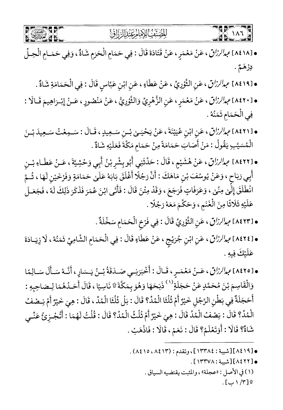 8420- عبد الرزاق، عَنْ مَعْمَرٍ، عَنِ الزُّهْرِيِّ، وَالثَّورِيِّ، عَنْ مَنصُورٍ، عَن إِبرَاهِيمَ، قَالاَ: فِي الْحَمَامِ ثَمَنُهُ.