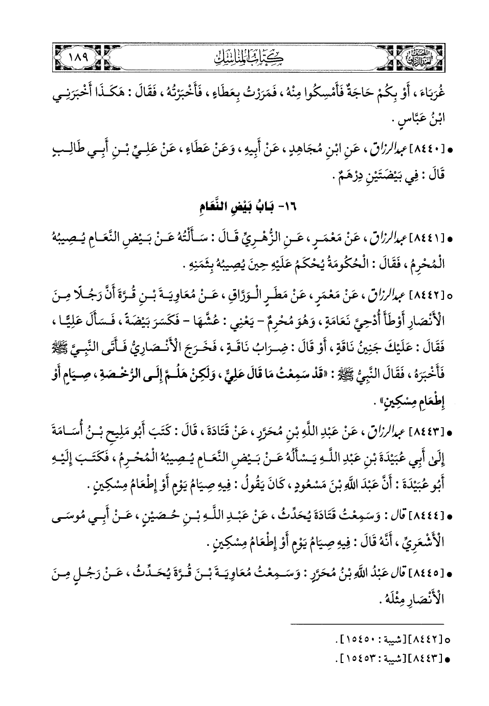 8441- عبد الرزاق، عَنْ مَعْمَرٍ، عَنِ الزُّهْرِيِّ، قَالَ: سَأَلْتُهُ عَن بَيْضِ النَّعَامِ يُصِيبُهُ المُحْرِمُ، فَقَالَ: الْحُكُومَةُ يُحْكَمُ عَلَيْهِ حِينَ يُصِيبُهُ بِثَمَنِهِ.