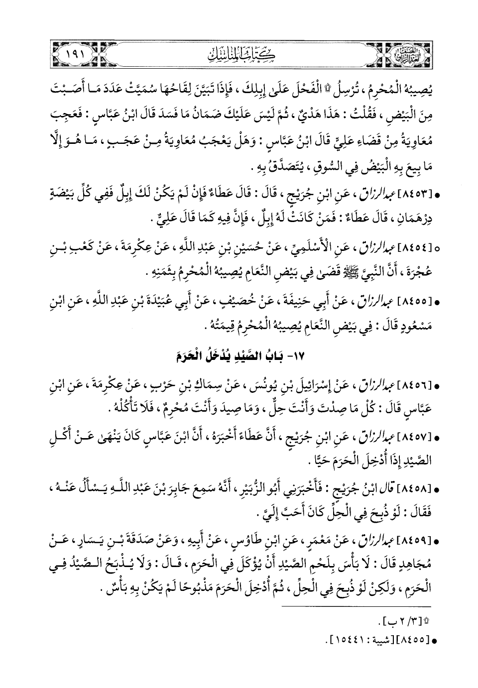 8459- عبد الرزاق، عَنْ مَعْمَرٍ، عَنِ ابْنِ طَاوُوسٍ، عَنْ أَبِيهِ، وَعَنْ صَدَقَةَ بْنِ يَسَارٍ، عَن مُجاهِدٍ قَالَ: لاَ بَأْسَ بِلَحْمِ الصَّيْدِ أَنْ يُؤْكَلَ فِي الْحَرَمِ، قَالَ: وَلاَ يُذْبَحُ الصَّيْدُ فِي الْحَرَمِ، وَلَكِنْ لَوْ ذُبِحَ فِي الْحِلِّ، ثُمَّ أُدْخِلَ الْحَرَمَ مَذْبُوحًا، لَمْ يَكُنْ بِهِ بَأْسٌ.