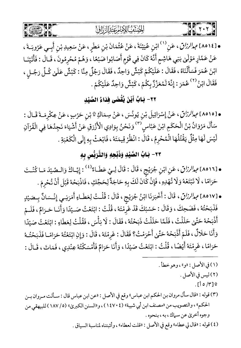 8517- عبد الرزاق، قَالَ: أَخْبَرَنَا ابْنُ جُرَيْجٍ، قَالَ: قُلْتُ لِعَطَاءٍ: أَمَرَنِي إِنْسَانُ بِصَيْدٍ فَذَبَحْتُهُ، فَضَحِكَ، وَقَالَ: حَسْبُكَ، قَدْ غَرِمْتَهُ، قُلْتُ: ابْتَعْتُ صَيْدًا وَأَنَا حَرَامٌ، فَلَمْ أَذْبَحْهُ، حَتَّى حَلَلْتُ، فَلَمَّا حَلَلْتُ ذَبَحْتُهُ، فَقَالَ: لاَ بَأْسَ، فَقُلْتُ لِعَطَاءَ: ابْتَعْتُ صَيْدًا وَأَنَا حَلاَلٌ، فَلَمْ أَذْبَحْهُ، حَتَّى أَحْرَمْتُ؟ فَقَالَ: غَرِمْتَهُ، قَالَ: وَإِنِ ابْتَعْتُهُ حَرَامًا، فَذَبَحْتُهُ حَرَامًا، غَرِمْتَهُ أَيْضًا، قُلْتُ: ابْتَعْتُ صَيْدًا وَأَنَا حَرَامٌ، فَأَمْسَكْتُهُ عِنْدِي فَمَاتَ؟ قَالَ: إِذًا تَغْرَمُهُ، قُلْتُ لِعَطَاءٍ: ابْتَعْتُهُ وَأَنَا حَرَامٌ، فَأَهْدَيْتُهُ لِقَوْمٍ حَلاَلٍ فَذَبَحُوهُ فِي حَرَمِي؟ قَالَ: تَغْرَمُهُ، قَالَ: قُلْتُ: فَلَمْ يَذْبَحُوهُ حَتَّى حَلَلْتُ، قَالَ: غُرْمُهُ عَلَيْكَ.
