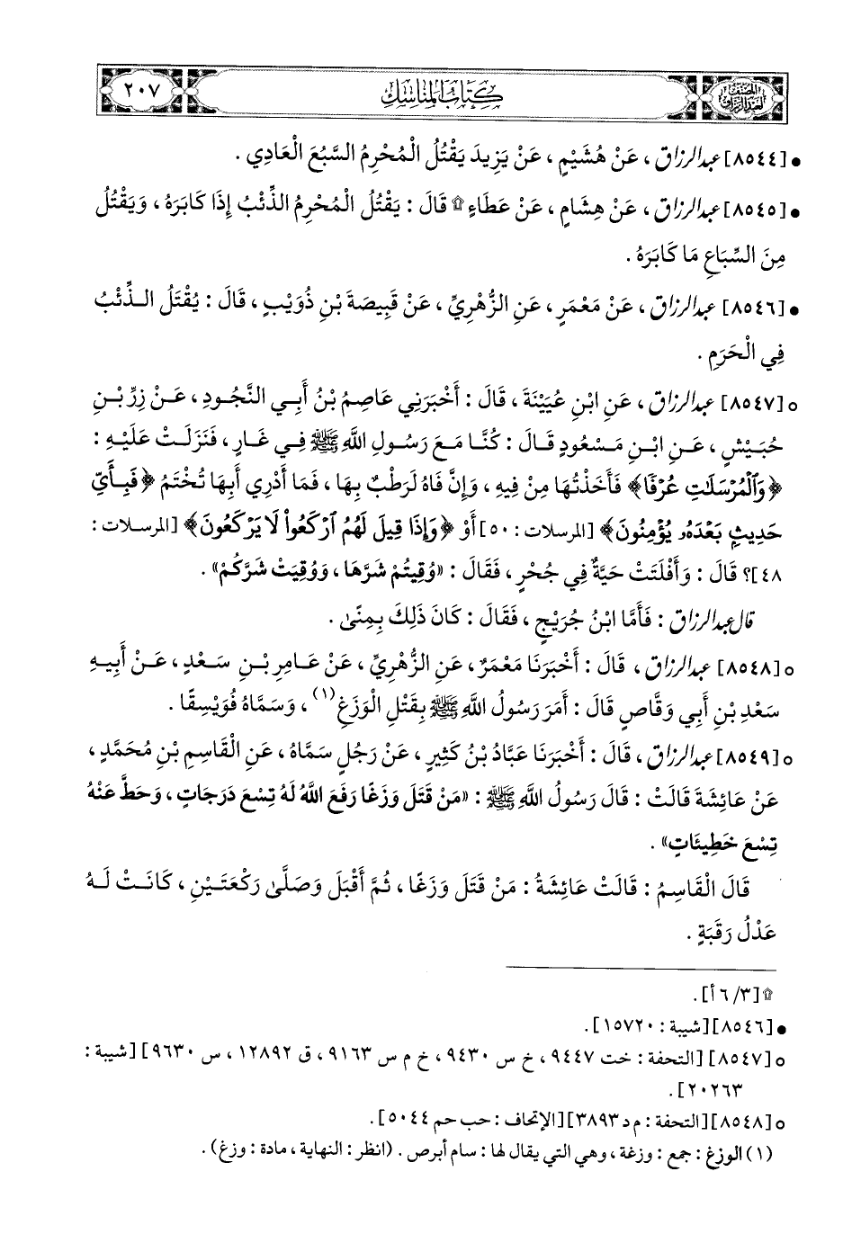 8544- عبد الرزاق، عَن هُشَيْمٍ، عَن يَزِيدَ: يَقْتُلُ المُحْرِمُ السَّبُعَ الْعَادِي.