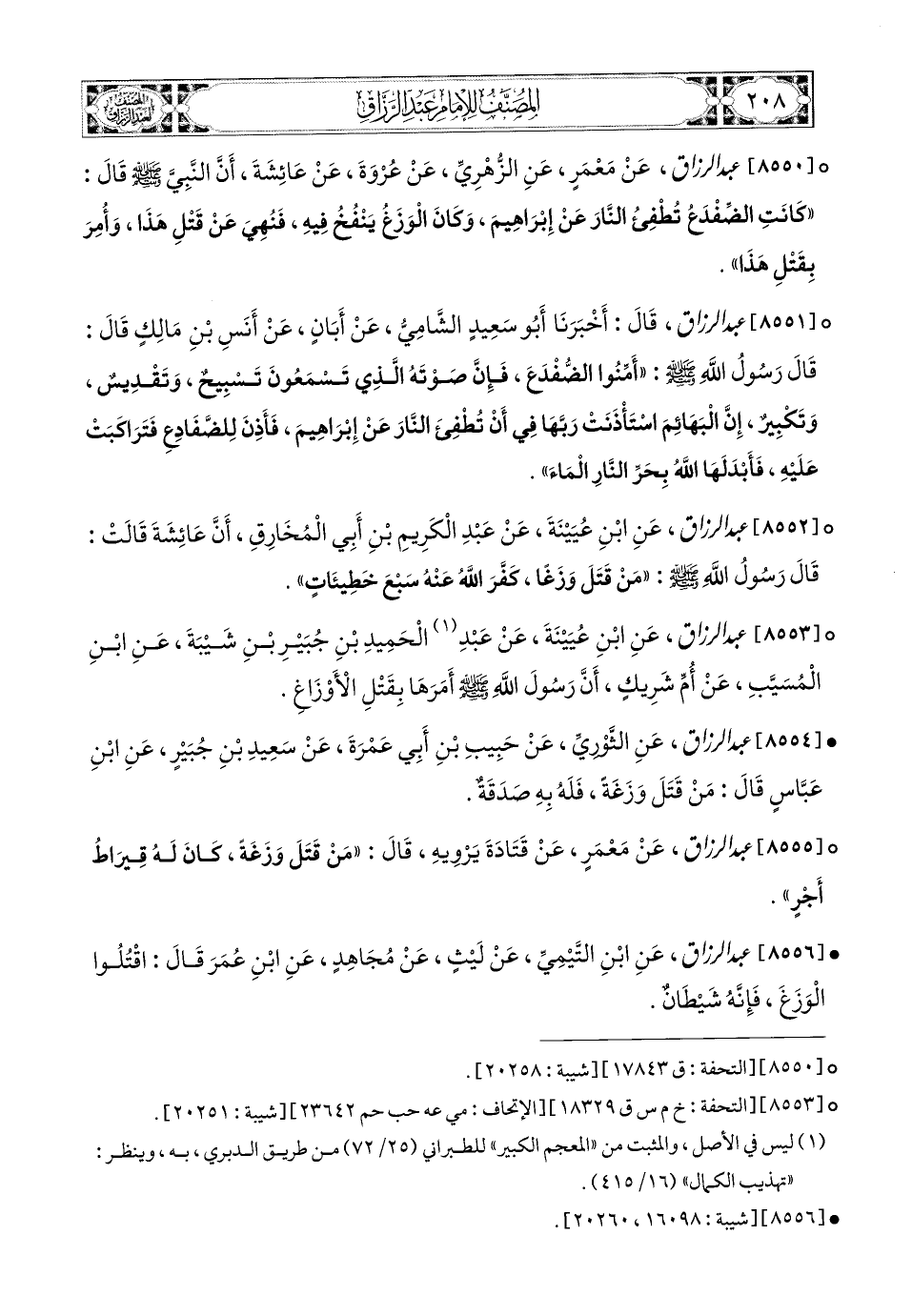 8550- عبد الرزاق، عَنْ مَعْمَرٍ، عَنِ الزُّهْرِيِّ، عَن عُرْوَةَ، عَنْ عَائِشَةَ، أَنَّ النَّبِيَّ صَلَّى اللهُ عَلَيْهِ وَسَلَّمَ قَالَ: كَانَتِ الضُّفْدَعُ تُطْفِئُ النَّارَ عَن إِبرَاهِيمَ، وَكَانَ الْوَزَغُ يَنْفُخُ فِيهِ، فَنُهِيَ عَن قَتْلِ هَذَا، وَأُمِرَ بِقَتْلِ هَذَا.
