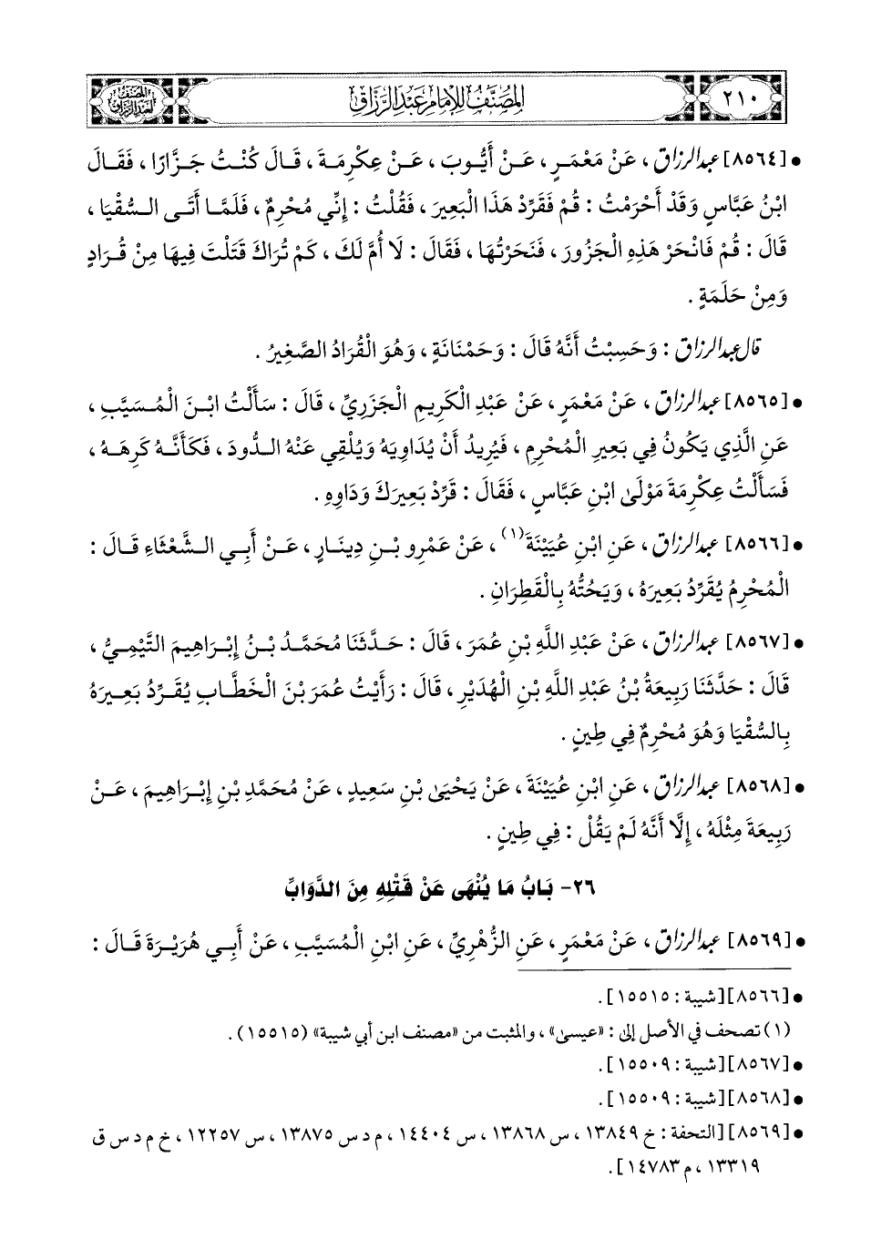 8565- عبد الرزاق، عَنْ مَعْمَرٍ، عَنْ عَبدِ الْكَرِيمِ الْجَزَرِيِّ، قَالَ: سَأَلْتُ ابْنَ المُسَيَّبِ عَنِ الَّذِي يَكُونَ فِي بَعِيرِ المُحْرِمِ، فَيُرِيدُ أَنْ يُدَاوِيَهُ، وَيُلْقِيَ عَنْهُ الدُّودَ، فَكَأَنَّهُ كَرِهَهُ، فَسَأَلْتُ عِكْرِمَةَ، مَوْلَى ابْنِ عَبَّاسٍ، فَقَالَ: قَرِّدْ بَعِيرَكَ وَدَاوِهِ.