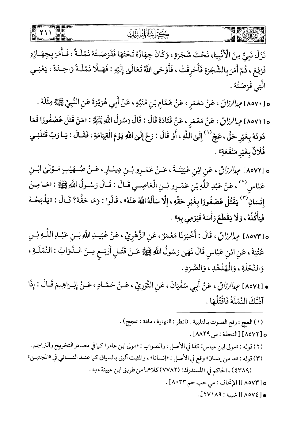 8573- عبد الرزاق، قَالَ: أَخْبَرَنَا مَعْمَرٌ، عَنِ الزُّهْرِيِّ، عَن عُبَيْدِ اللهِ بْنِ عَبدِ اللهِ بْنِ عُتْبَةَ، عَنِ ابْنِ عَبَّاسٍ، قَالَ: نَهَى رَسُولُ اللهِ صَلَّى اللهُ عَلَيْهِ وَسَلَّمَ عَن قَتْلِ أَرْبَعٍ مِنَ الدَّوَابِّ: النَّمْلَةِ، وَالنَّحْلَةِ، وَالْهُدْهُدِ، وَالصُّرَدِ.