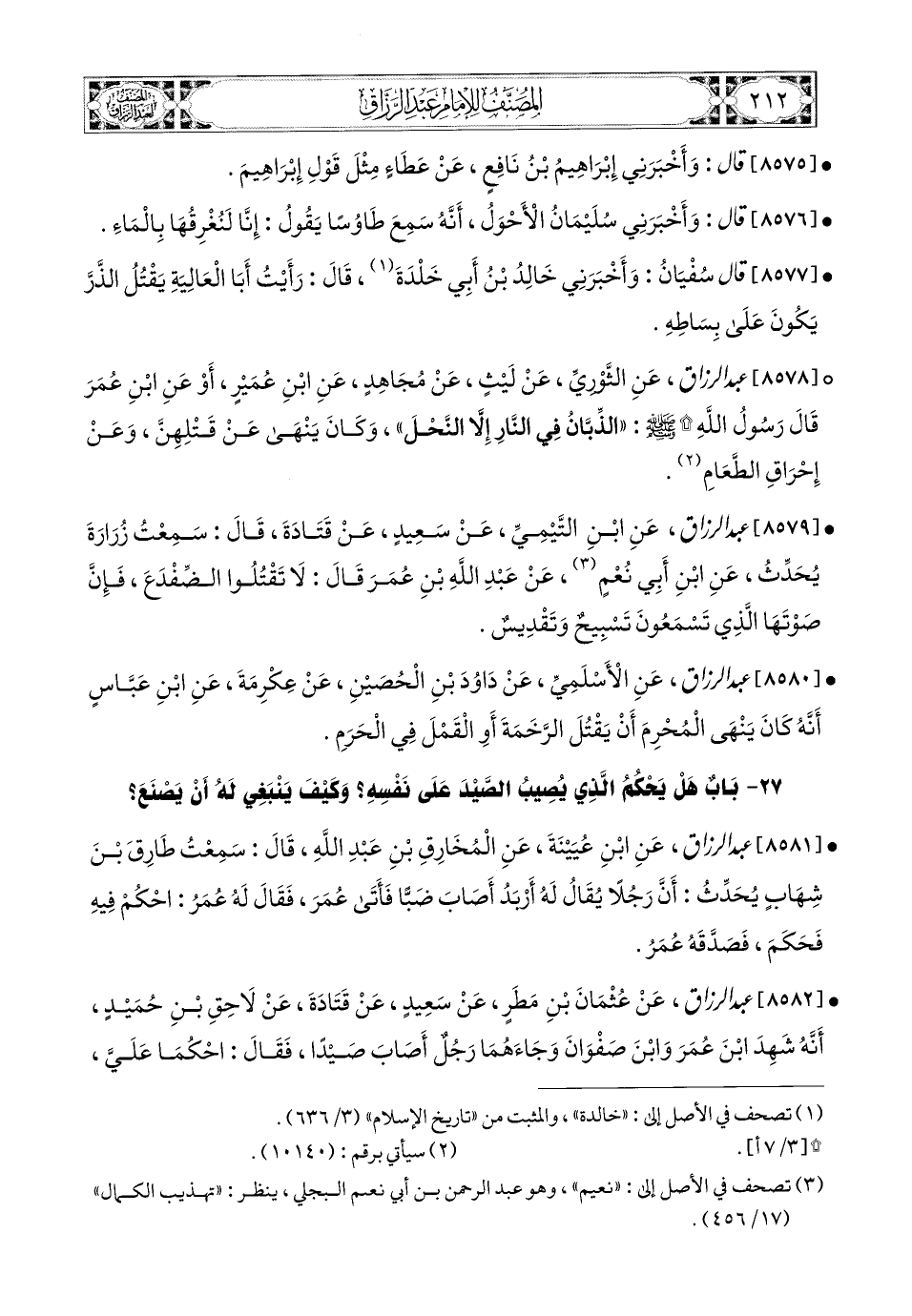 8580- عبد الرزاق، عَنِ الأَسْلَمِيِّ، عَن دَاوُدَ بْنِ الْحُصَيْنِ، عَنْ عِكْرِمَةَ، عَنِ ابْنِ عَبَّاسِ، أَنَّهُ كَانَ يَنْهَى المُحْرِمَ أَنْ يَقْتُلَ الرَّخَمَةَ، أَوِ الْقُمَّلَ فِي الْحَرَمِ.