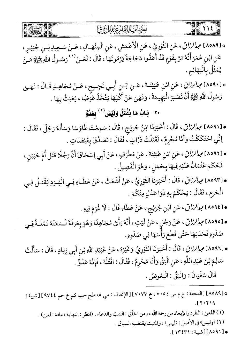 8593- عبد الرزاق، قَالَ: أَخْبَرَنَا الثَّورِيُّ، عَنْ أَشْعَثَ، عَنْ عَطَاءٍ فِي الْقَرَدِ يُقْتَلُ فِي الْحَرَمِ؟ فَقَالَ: يَحْكُمُ بِهِ ذَوَا عَدْلٍ مِنْكُمْ.