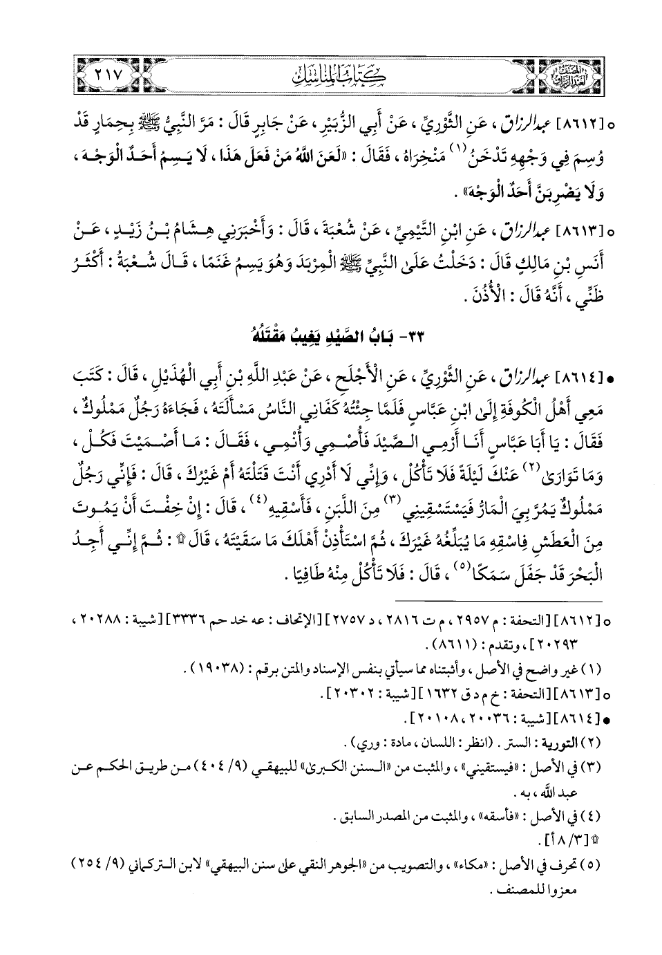 8612- عبد الرزاق، عَنِ الثَّورِيِّ، عَنْ أَبِي الزُّبَيْرِ، عَن جَابِرٍ قَالَ: مَرَّ النَّبِيُّ صَلَّى اللهُ عَلَيْهِ وَسَلَّمَ بِحِمَارٍ قَدْ وُسِمَ فِي وَجْهِهِ، تَدْخَنُ مِنْخَرَاهُ، فَقَالَ: لَعَنَ اللهُ مَنْ فَعَلَ هَذَا، لاَ يَسِمْ أَحَدٌ الْوَجْهَ، وَلاَ يَضْرِبَنَّ أَحَدٌ الْوَجْهَ.