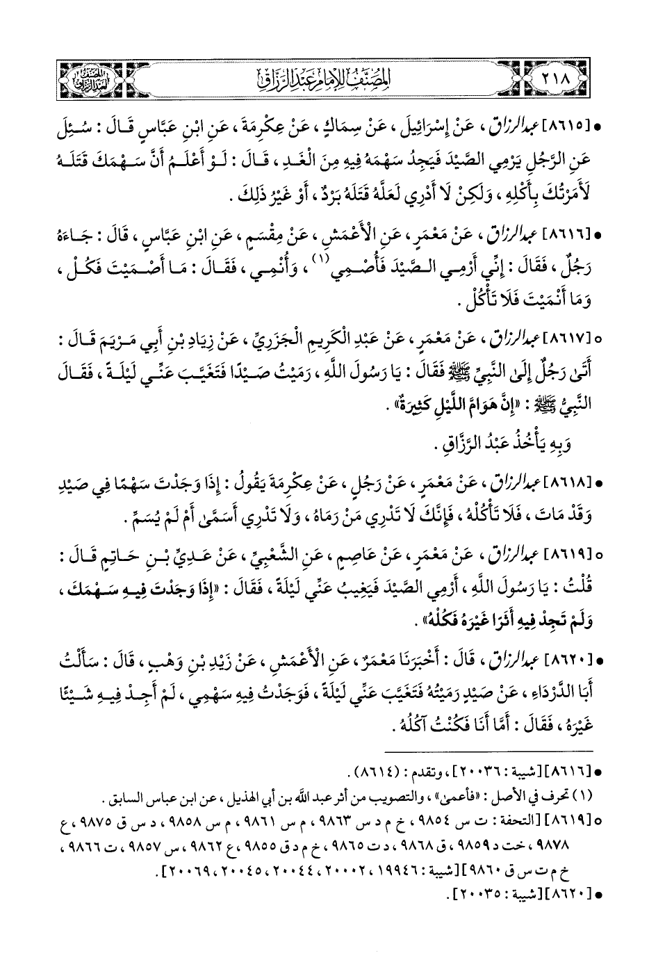 8616- عبد الرزاق، عَنْ مَعْمَرٍ، عَنِ الأَعمَشِ، عَن مِقْسَمٍ، عَنِ ابْنِ عَبَّاسٍ، قَالَ: جَاءَهُ رَجُلٌ فَقَالَ: إِنِّي أَرْمِي الصَّيْدَ فَأُصْمِي، وَأُنْمِي، فَقَالَ: مَا أَصْمَيْتَ فَكُلْ، وَمَا أَنْمَيْتَ فَلاَ تَأْكُلْ.