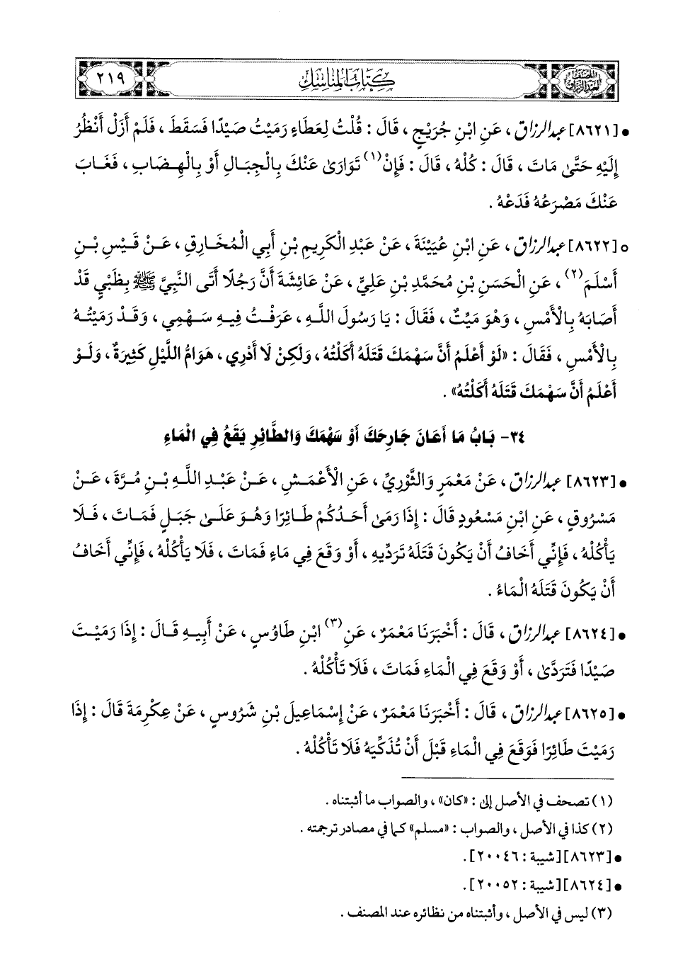 8622 - عبد الرزاق، عَنِ ابْنِ عُيَيْنَةَ، عَنْ عَبدِ الْكَرِيمِ بْنِ أَبِي المُخَارِقِ، عَن قَيْسِ بْنِ مُسْلِمٍ (1)، عَنِ الْحَسَنِ بْنِ مُحَمَّدِ بْنِ عَلِيٍّ، عَنْ عَائِشَةَ، أَنَّ رَجُلاً أَتَى النَّبِيَّ صَلَّى اللهُ عَلَيْهِ وَسَلَّمَ بِظَبْيٍ قَدْ أَصَابَهُ بِالأَمْسِ، وَهُوَ مَيِّتٌ، فَقَالَ: يَا رَسُولَ اللهِ، عَرَفْتُ فِيهِ سَهْمِي، وَقَدْ رَمَيْتُهُ بِالأَمْسِ، فَقَالَ: لَوْ أَعْلَمُ أَنَّ سَهْمَكَ قَتَلَهُ أَكَلْتُهُ، وَلَكِنْ لاَ أَدْرِي هَوَامُّ اللَّيْلِ كَثِيرَةٌ، وَلَوْ أَعْلَمُ أَنَّ سَهْمَكَ قَتَلَهُ أَكَلْتُهُ.