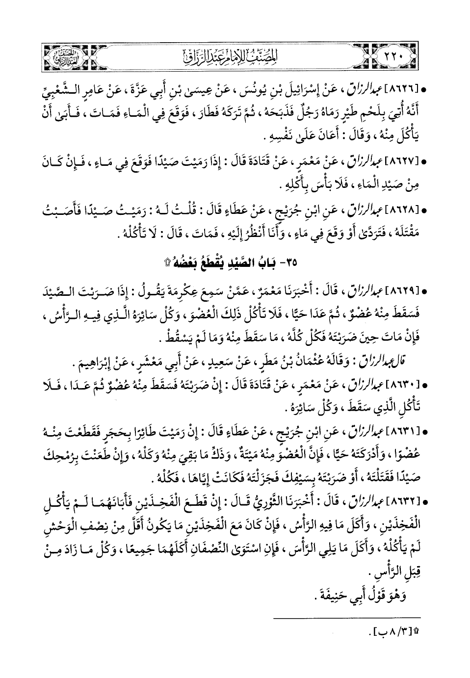 8629- عبد الرزاق، قَالَ: أَخْبَرَنَا مَعْمَرٌ، عَمَّنَ سَمِعَ عِكْرِمَةَ يَقُولُ: إِذَا ضَرَبْتَ الصَّيْدَ فَسَقَطَ مِنْهُ عُضْوٌ، ثُمَّ عَدَا حَيًّا، فَلاَ تَأْكُلْ ذَلِكَ الْعُضْوَ، وَكُلْ سَائِرَهُ الَّذِي فِيهِ الرَّأْسُ، فَإِنْ مَاتَ حِينَ ضَرَبْتَهُ، فَكُلْ كُلَّهُ مَا سَقَطَ مِنْهُ، وَمَا لَمْ يَسْقُطْ.