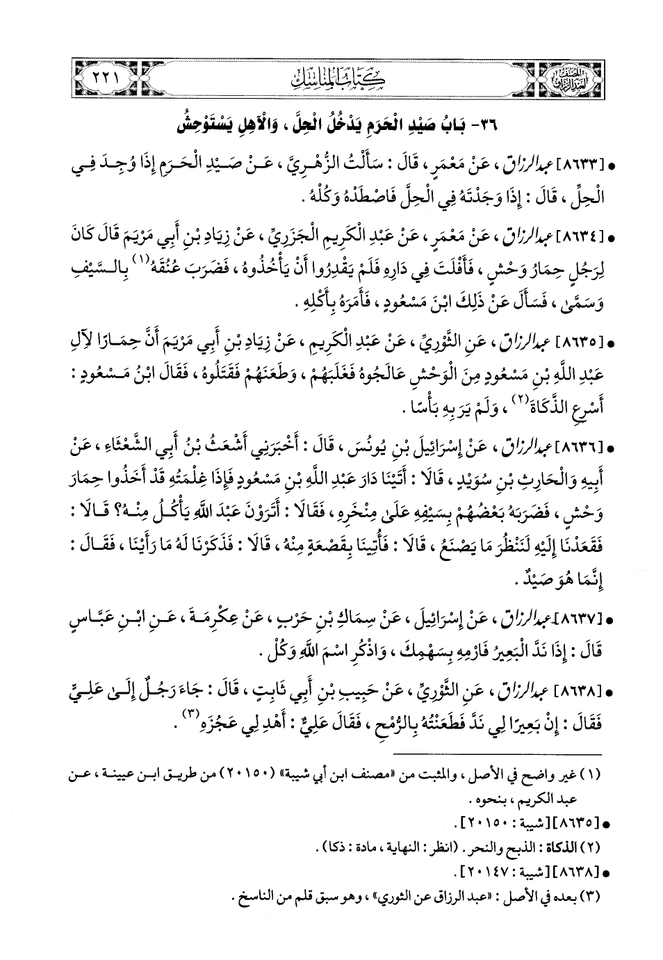 8634- عبد الرزاق، عَنْ مَعْمَرٍ، عَنْ عَبدِ الْكَرِيمِ الْجَزَرِيِّ، عَن زِيَادِ بْنِ أَبِي مَرْيَمَ قَالَ: كَانَ لِرَجُلٍ حِمَارُ وَحْشٍ، فَأَفْلَتَ فِي دَارِهِ، فَلَمْ يَقْدِرُوا أَنْ يَأْخُذُوهُ، فَضَرَبَ عُنُقَهُ بِالسَّيْفِ وَسَمَّى، فَسَأَلَ عَن ذَلِكَ ابْنَ مَسْعُودٍ، فَأَمَرَهُ بِأَكْلِهِ.