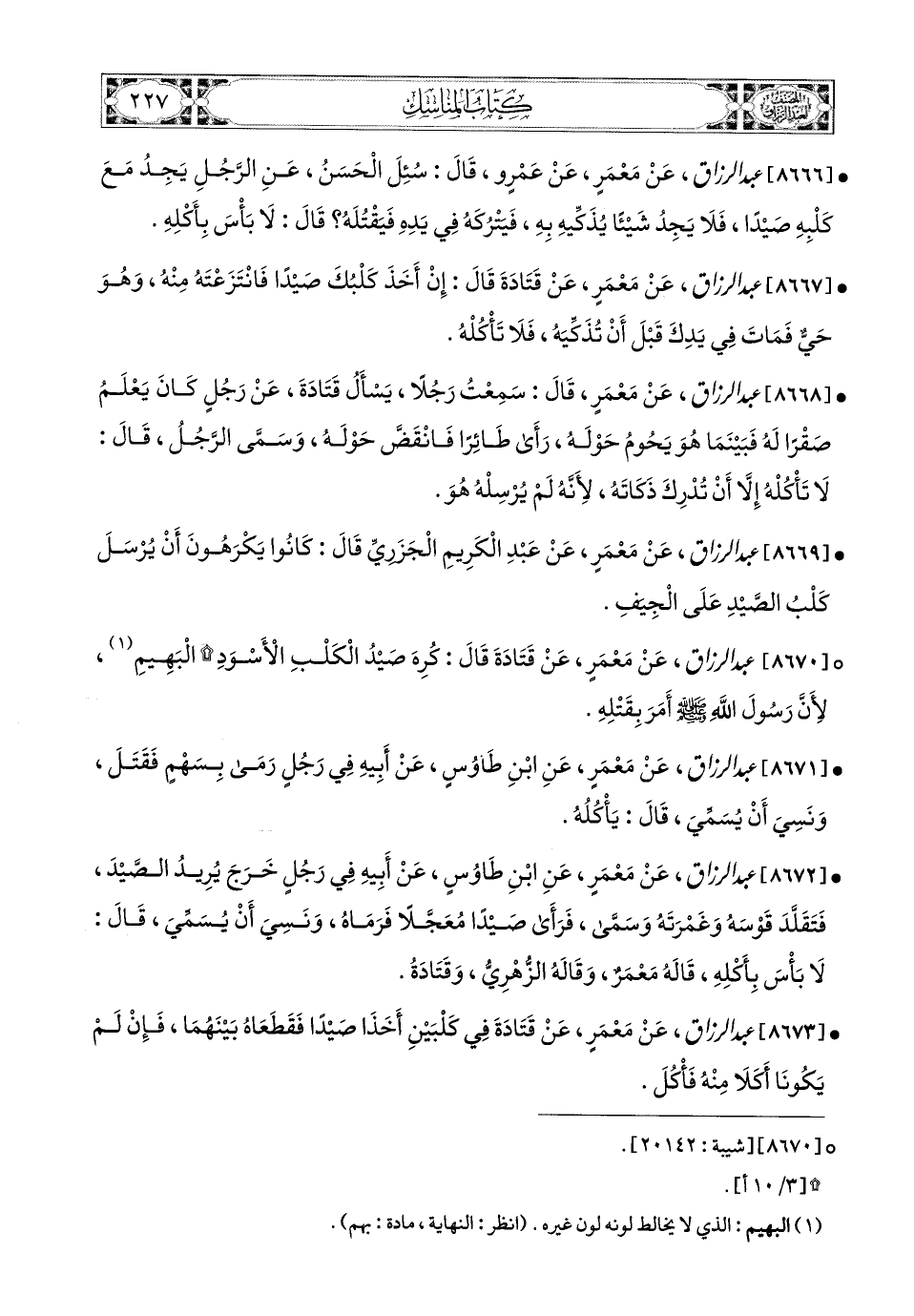 8669- عبد الرزاق، عَنْ مَعْمَرٍ، عَنْ عَبدِ الْكَرِيمِ الْجَزَرِيِّ، قَالَ: كَانُوا يَكْرَهُونَ أَنْ يُرْسَلَ كَلْبُ الصَّيْدِ عَلَى الْجِيَفِ.