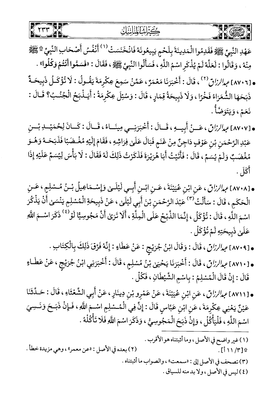 8708- عبد الرزاق، عَنِ ابْنِ عُيَيْنَةَ، عَنِ ابْنِ أَبِي لَيْلَى، وَإِسْمَاعِيلُ بن مُسْلِمٍ، عَنِ الْحَكَمِ، قَالَ: سَأَلْتُ عَبدَ الرَّحْمَنِ بن أَبِي لَيْلَى عَن ذَبِيحَةِ المُسْلِمِ، يَنْسَى أَنْ يَذْكُرَ اسْمَ اللهِ، قَالَ: تُؤْكَلُ، إِنَّمَا الذَّبْحُ عَلَى المِلَّةِ، أَلاَ تَرَى أَنَّ مَجُوسِيًّا لَوْ ذَكَرَ اسْمَ اللهِ عَلَى ذَبِيحَتِهِ لَمْ تُؤْكَلْ.
