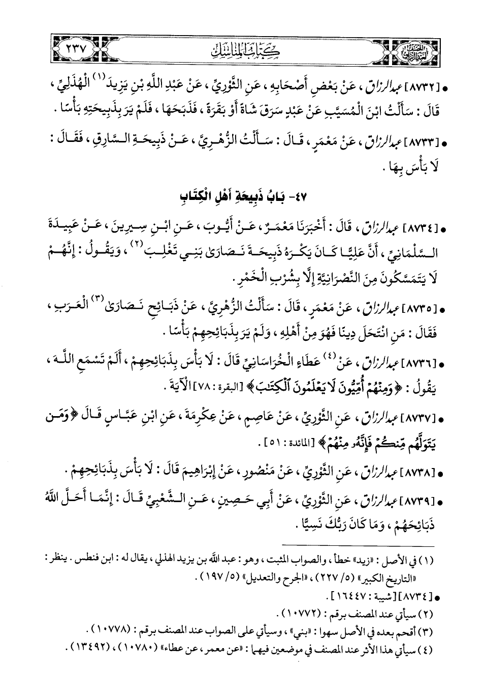 8735- عبد الرزاق، عَنْ مَعْمَرٍ، قَالَ: سَأَلْتُ الزُّهْرِيَّ عَن ذَبَائِحِ نَصَارَى الْعَرَبِ، فَقَالَ: مَنِ انْتَحَلَ دِينًا فَهُوَ مِنْ أَهْلِهِ، وَلَمْ يَرَ بِذَبَائِحِهِمْ بَأْسًا.
