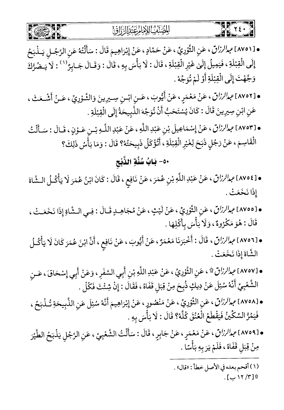 8751- عبد الرزاق، عَنِ الثَّورِيِّ، عَن حَمَّادٍ، عَن إِبرَاهِيمَ، قَالَ: سَأَلْتُهُ عَنِ الرَّجُلِ يَذْبَحُ إِلَى الْقِبْلَةِ، فَيَمِيلُ إِلَى غَيْرِ الْقِبْلَةِ؟ قَالَ: لاَ بَأْسَ بِهِ، قَالَ: وَقَالَ جَابِرٌ: لاَ يَضُرُّكَ وَجَّهْتَ إِلَى الْقِبْلَةِ، أَوْ لَمْ تُوَجِّهْ.