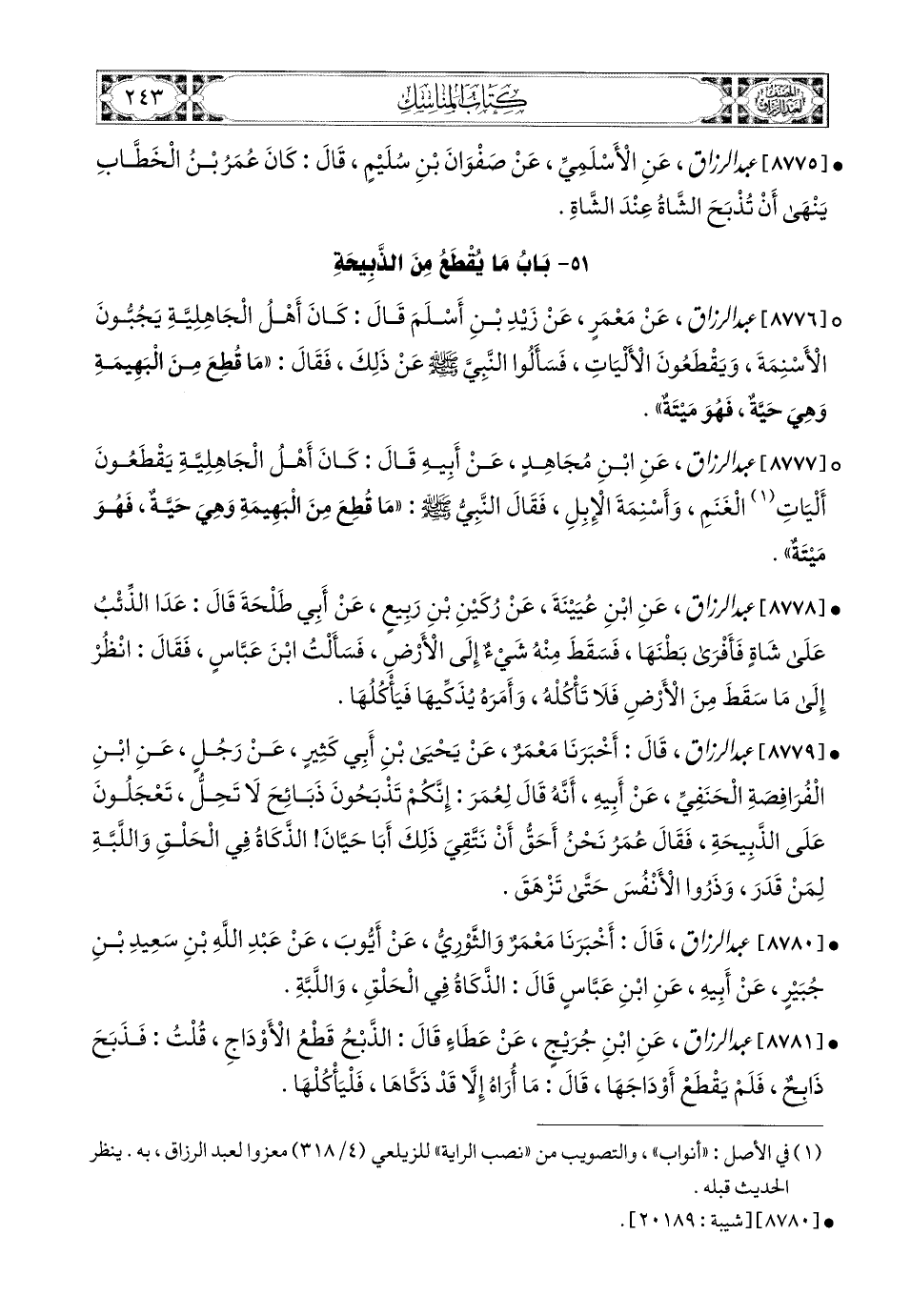 8776- عبد الرزاق، عَنْ مَعْمَرٍ، عَن زَيْدِ بْنِ أَسْلَمَ قَالَ: كَانَ أَهْلُ الْجَاهِلَيَّةِ يَجُبُّونَ الأَسْنِمَةَ، وَيَقْطَعُونَ الأَلْيَاتِ، فَسَأَلُوا النَّبِيَّ صَلَّى اللهُ عَلَيْهِ وَسَلَّمَ عَن ذَلِكَ؟ فَقَالَ: مَا قُطِعَ مِنَ الْبَهِيمَةِ وَهِيَ حَيَّةٌ، فَهُوَ مَيْتَةٌ.
