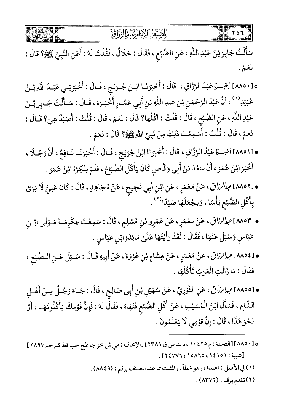 8851- أخبرنا عبد الرزاق، قَالَ: أَخْبَرَنَا ابْنُ جُرَيْجٍ، قَالَ: أَخْبَرَنَا نَافِعٌ، أَنَّ رَجُلاً أَخْبَرَ ابْنَ عُمَرَ، أَنَّ سَعْدَ بن أَبِي وَقَّاصٍ كَانَ يَأْكُلُ الضِّبَاعَ، فَلَمْ يُنْكِرْهُ ابْنُ عُمَرَ.