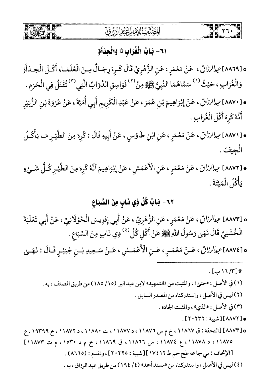 8869- عبد الرزاق، عَنْ مَعْمَرْ، عَنِ الزُّهْرِيِّ، قَالَ: كَرِهَ رِجَالٌ مِنَ الْعُلَمَاءِ أَكْلَ الْحَدَأَةِ، وَالْغُرَابِ، حَيْثُ سَمَّاهُمَا النَّبِيُّ صَلَّى اللهُ عَلَيْهِ وَسَلَّمَ مِنْ فَوَاسِقِ الدَّوَابِّ الَّتِي تُقْتَلُ فِي الْحَرَمِ.