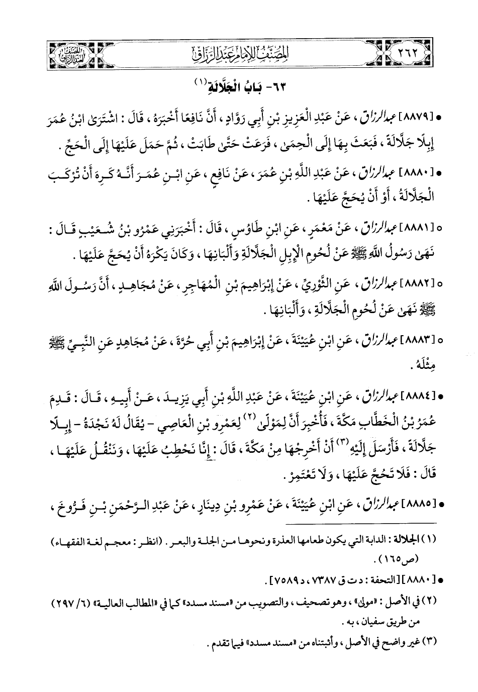 8881- عبد الرزاق، عَنْ مَعْمَرٍ، عَنِ ابْنِ طَاوُوسٍ، قَالَ: أَخْبَرَنِي عَمْرُو بن شُعَيْبٍ قَالَ: نَهَى رَسُولُ اللهِ صَلَّى اللهُ عَلَيْهِ وَسَلَّمَ عَن لُحُومِ الإِبِلِ الْجَلاَّلَةِ وَأَلْبَانِهَا، وَكَانَ يَكْرَهُ أَنْ يُحَجَّ عَلَيْهَا.
