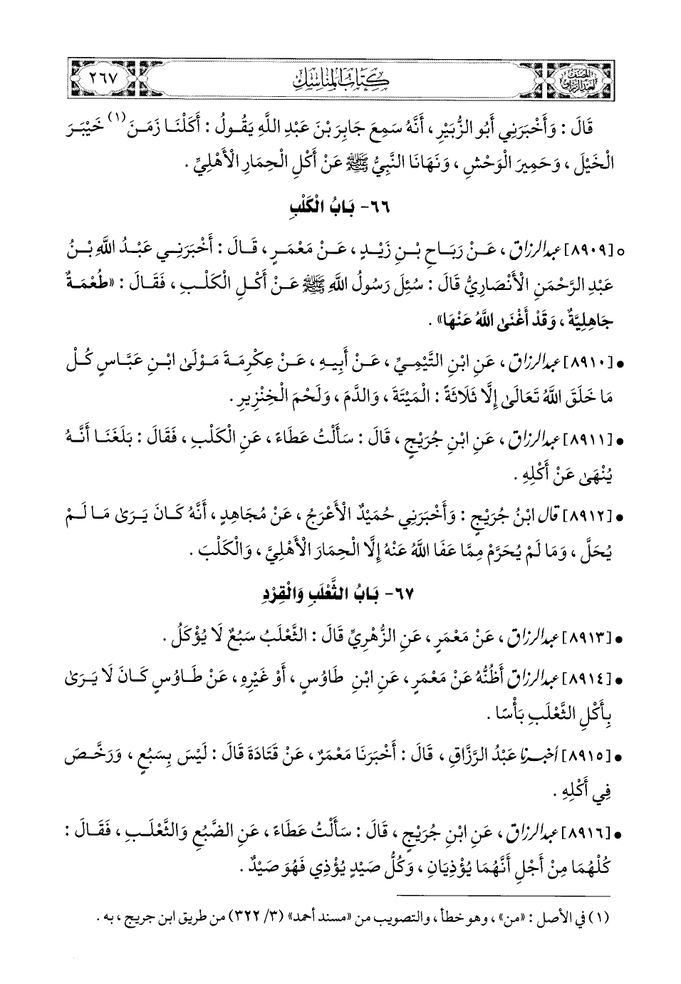 8909- عبد الرزاق، عَن رَبَاحِ بْنِ زَيْدٍ، عَنْ مَعْمَرٍ، قَالَ: أَخْبَرَنِي عَبدُ اللهِ بن عَبدِ الرَّحْمَنِ الأَنْصَارِيُّ قَالَ: سُئِلَ رَسُولُ اللهِ صَلَّى اللهُ عَلَيْهِ وَسَلَّمَ عَنْ أَكْلِ الْكَلْبِ؟ فَقَالَ: طُعْمَةٌ جَاهِلِيَّةٌ، وَقَدْ أَغْنَى اللهُ عَنْهَا.