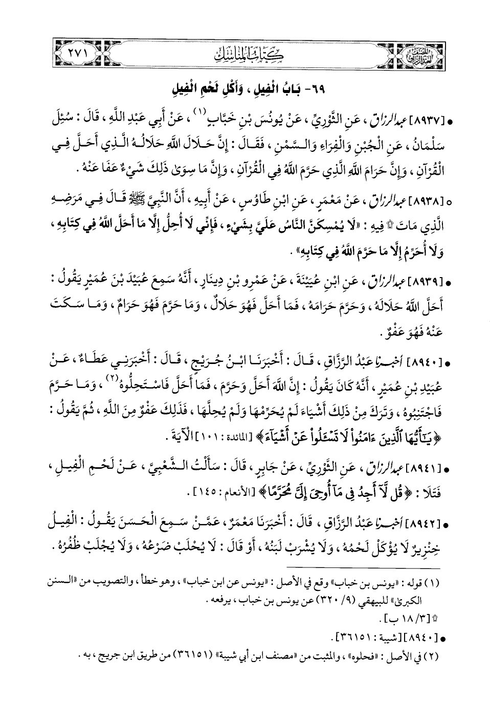 8941- عبد الرزاق، عَنِ الثَّورِيِّ، عَن جَابِرٍ قَالَ: سَأَلْتُ الشَّعْبِيَّ عَن لَحْمِ الْفِيلِ؟ فَتَلاَ: {قُلْ لاَ أَجِدُ فِيمَا أُوحِيَ إِلَيَّ مُحَرَّمًا}.