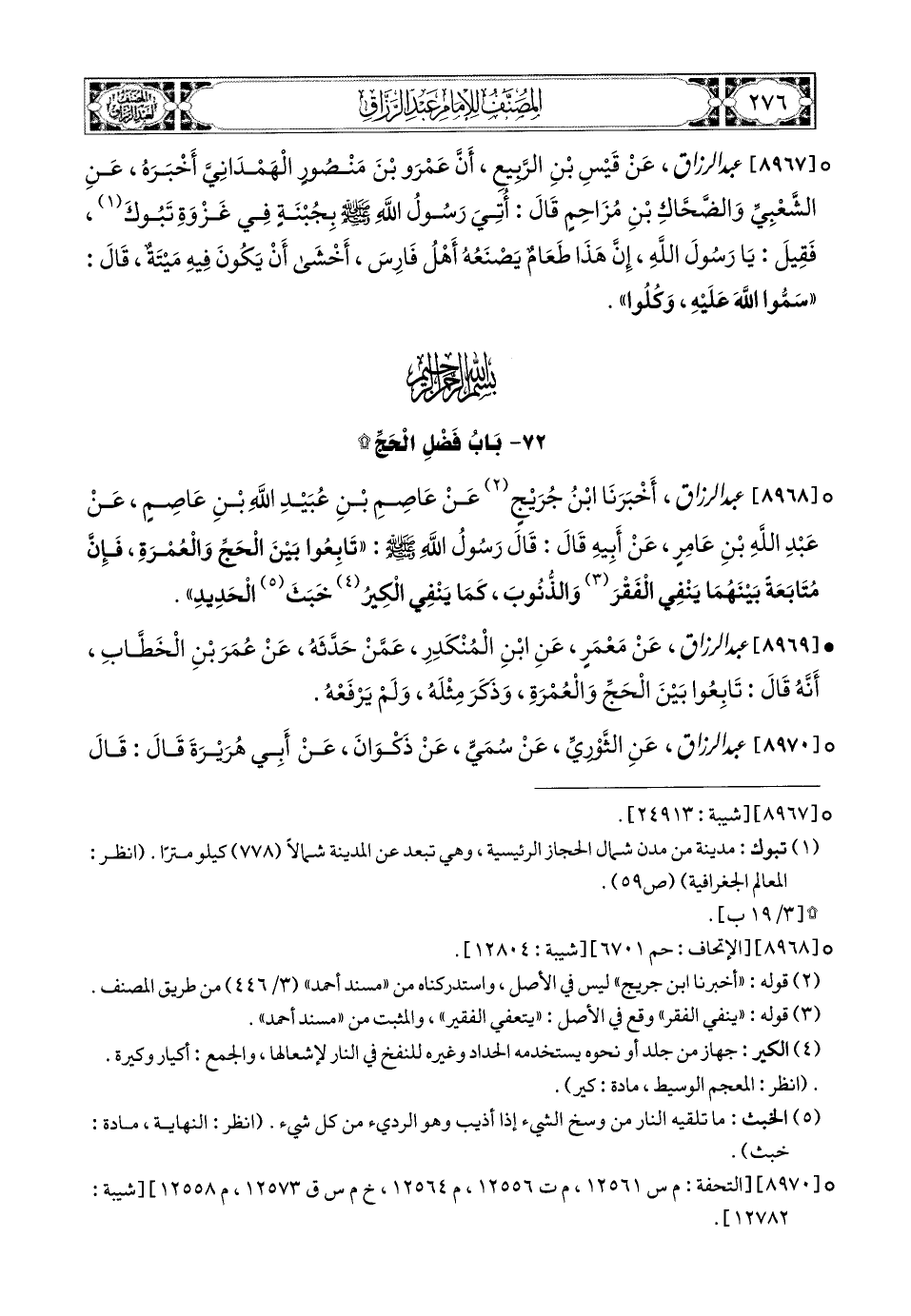 8968- عبد الرزاق، أَخْبَرَنَا ابْنُ جُرَيْجٍ، عَنْ عَاصِمِ بْنِ عُبَيْدِ اللهِ بْنِ عَاصِمٍ، عَنْ عَبدِ اللهِ بْنِ عَامِرٍ، عَنْ أَبِيهِ، قَالَ: قَالَ رَسُولُ اللهِ صَلَّى اللهُ عَلَيْهِ وَسَلَّمَ: تَابِعُوا بَيْنَ الْحَجِّ وَالْعُمْرَةِ، فَإِنَّ مُتَابَعَةً بَيْنَهُمَا يَنْفِي الْفَقْرَ وَالذُّنُوبَ، كَمَا يَنْفِي الْكِيرُ خَبَثَ الْحَدِيدِ.