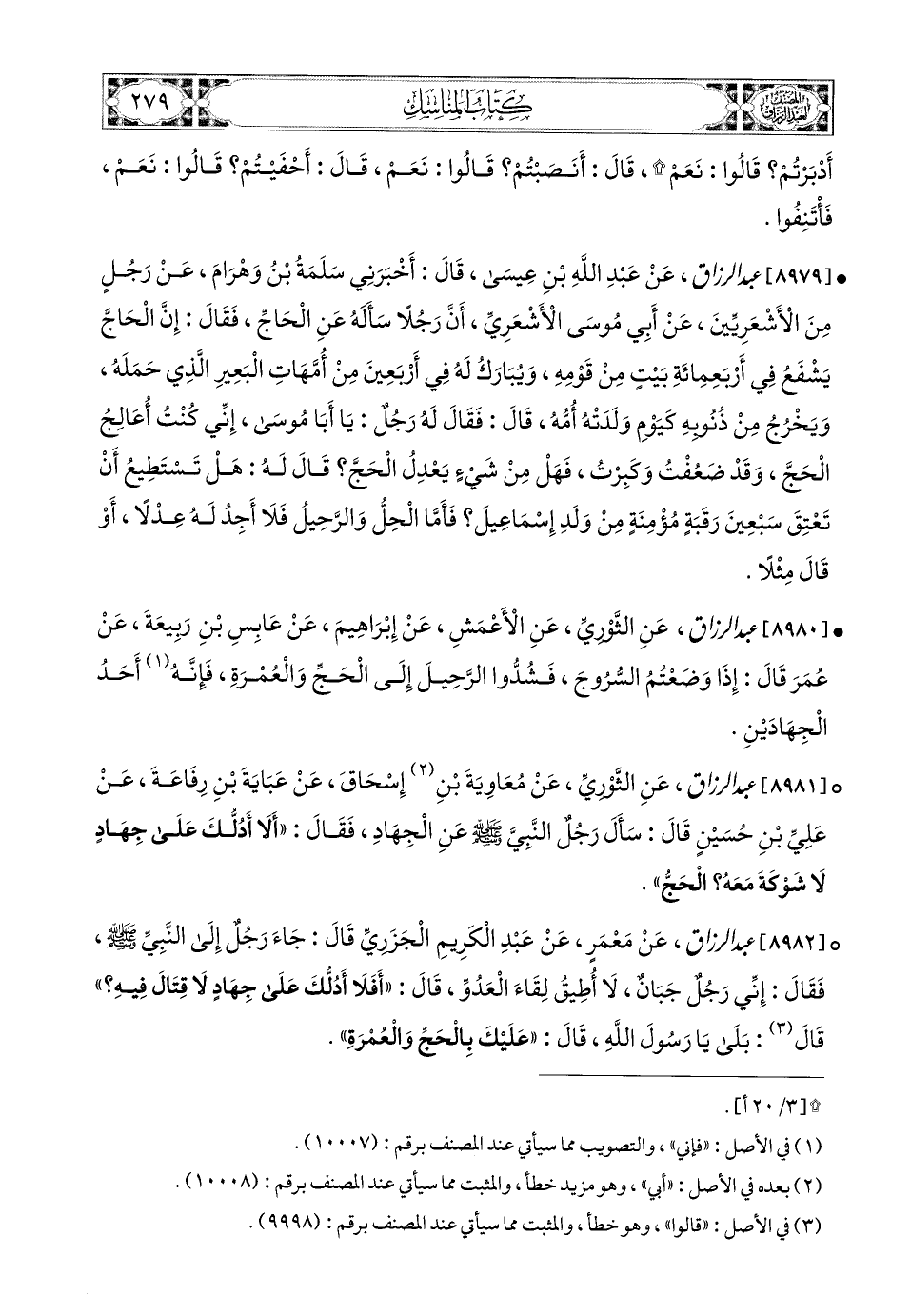 8981- عبد الرزاق، عَنِ الثَّورِيِّ، عَن مُعَاوِيَةَ بْنِ إِسْحَاقَ، عَنْ عَبَايَةَ بْنِ رِفَاعَةَ، عَنْ عَلِيِّ بْنِ حُسَيْنٍ قَالَ: سَأَلَ رَجُلٌ النَّبِيَّ صَلَّى اللهُ عَلَيْهِ وَسَلَّمَ عَنِ الْجِهَادِ، فَقَالَ: أَلاَ أَدُلُّكَ عَلَى جِهَادٍ لاَ شَوْكَةَ مَعَهُ؟ الْحَجُّ.