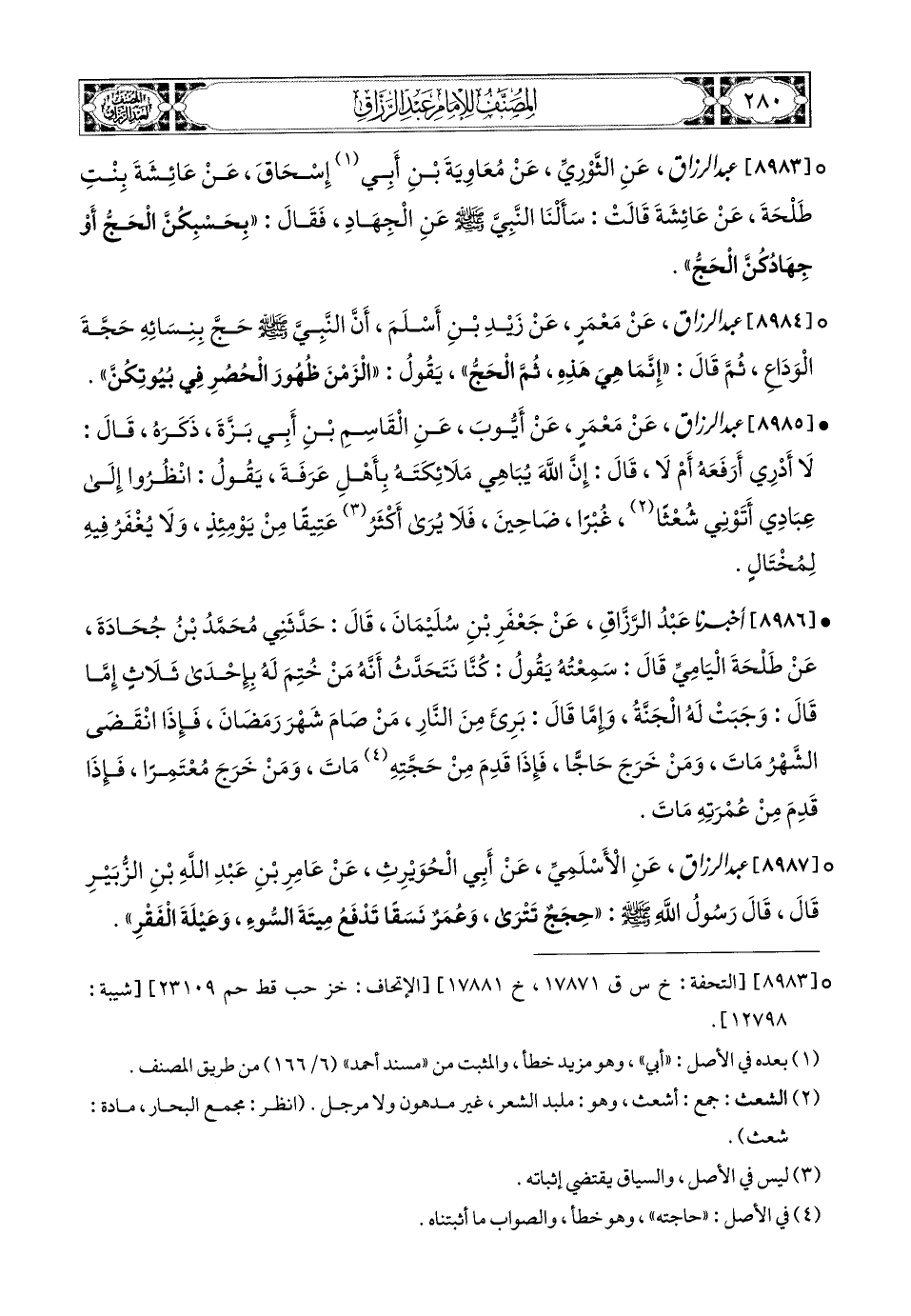 8987- عبد الرزاق، عَنِ الأَسْلَمِيِّ، عَنْ أَبِي الْحُوَيْرِثِ، عَنْ عَامِرِ بْنِ عَبدِ اللهِ بْنِ الزُّبَيْرِ قَالَ: قَالَ رَسُولُ اللهِ صَلَّى اللهُ عَلَيْهِ وَسَلَّمَ: حِجَجٌ تَتْرَى، وَعُمَرٌ نَسَقًا، تَدْفَعُ مِيتَةَ السُّوءِ، وَعَيْلَةَ الْفَقْرِ.