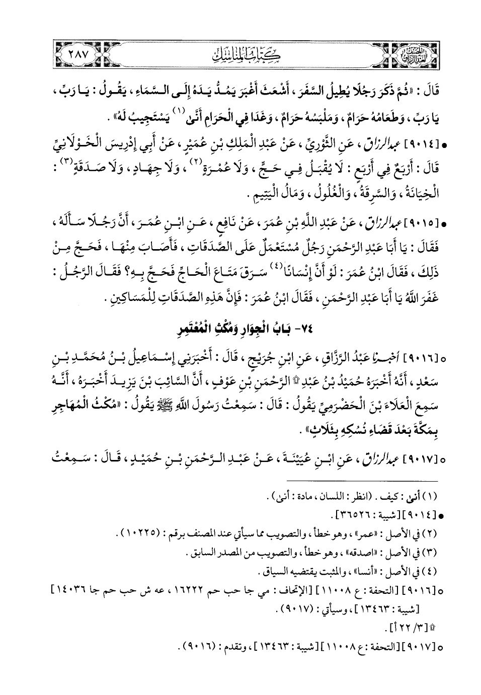 9017- عبد الرزاق، عَنِ ابْنِ عُيَيْنَةَ، عَنْ عَبدِ الرَّحْمَنِ بْنِ حُمَيْدٍ، قَالَ: سَمِعْتُ ابنَ عَبدِ الْعَزِيزِ يَسْأَلُ جُلَسَاءَهُ وَهُوَ أَمِيرٌ بِالمَدِينَةِ، مَا سَمِعْتُمْ فِي المُقَامِ بِمَكَّةَ؟ فَقَالَ لَهُ السَّائِبُ بن يَزِيدَ: قَالَ الْعَلاَءُ بن الْحَضْرَمِيِّ: قَالَ رَسُولُ اللهِ صَلَّى اللهُ عَلَيْهِ وَسَلَّمَ: مُكْثُ المُهَاجِرِ بَعْدَ قَضَاءِ نُسُكِهِ ثَلاَثٌ.