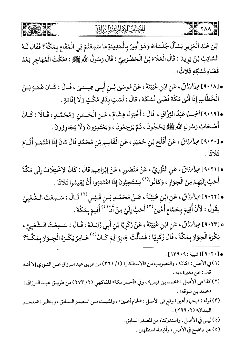 9023 - عبد الرزاق، عَنِ ابْنِ عُيَيْنَةَ، عَن زَكَرِيَّا بنِ أَبِي زَائِدَةَ، قَالَ: سَمِعْتُ الشَّعْبِيَّ، يَكْرَهُ الْجِوَارَ بِمَكَّةَ، قَالَ زَكَرِيَّا: فَسَأَلْتُ جَابِرًا لِمَ كَانَ (1) عَامِرٌ يَكْرَهُ الْجِوَارَ بِمَكَّةَ؟ قَالَ: مِنْ أَجْلِ كِتَابِ النَّبِيِّ صَلَّى اللهُ عَلَيْهِ وَسَلَّمَ إِلَى خُزَاعَةَ: أَنَّ مَنْ أَقَامَ مِنْكُمْ فِي أَهْلِهِ فَهُوَ مُهَاجَرٌ، إِلاَّ أَنْ يَسْكُنَ، إِلاَّ فِي حَجٍّ، أَوْ عُمْرَةٍ.