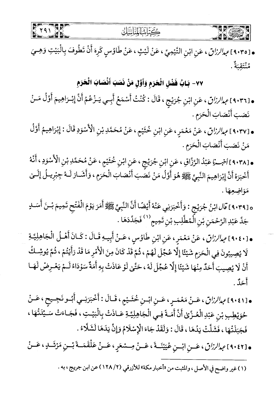 9036- عبد الرزاق، عَنِ ابْنِ جُرَيْجٍ، قَالَ: كُنْتُ أَسْمَعُ أَبِي يَزْعُمُ أَنَّ إِبرَاهِيمَ أَوَّلَ مَنْ نَصَبَ أَنْصَابَ الْحَرَمِ.