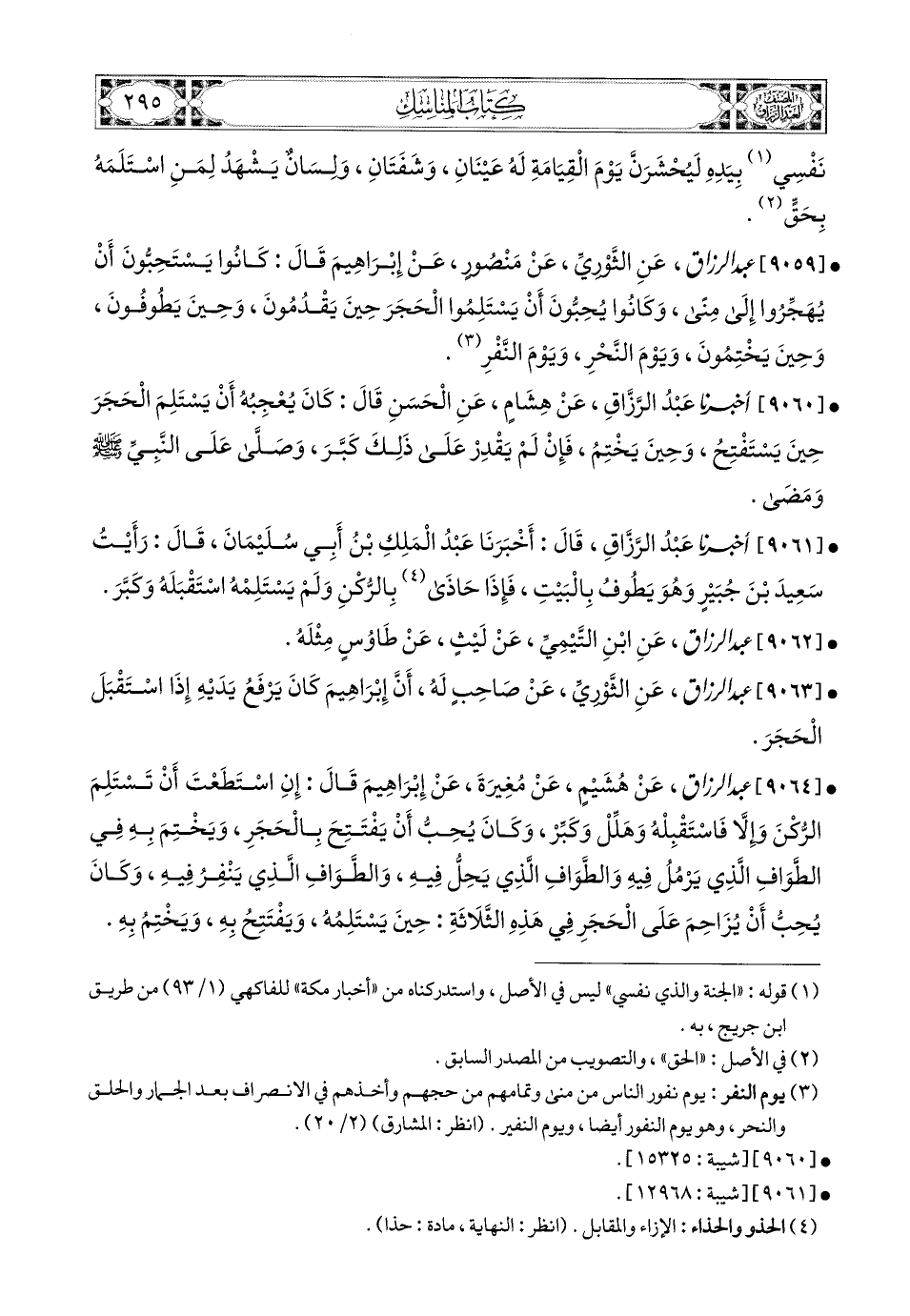 9059- عبد الرزاق، عَنِ الثَّورِيِّ، عَنْ مَنصُورٍ، عَن إِبرَاهِيمَ، قَالَ: كَانُوا يَسْتَحِبُّونَ أَنْ يُهَجِّرُوا إِلَى مِنًى، وَكَانُوا يُحِبُّونَ أَنْ يَسْتَلِمُوا الْحَجَرَ حِينَ يَقْدُمُونَ، وَحِينَ يَطُوفُونَ، وَحِينَ يَخْتِمُونَ، وَيَوْمَ النَّحْرِ، وَيَوْمَ النَّفْرِ.
