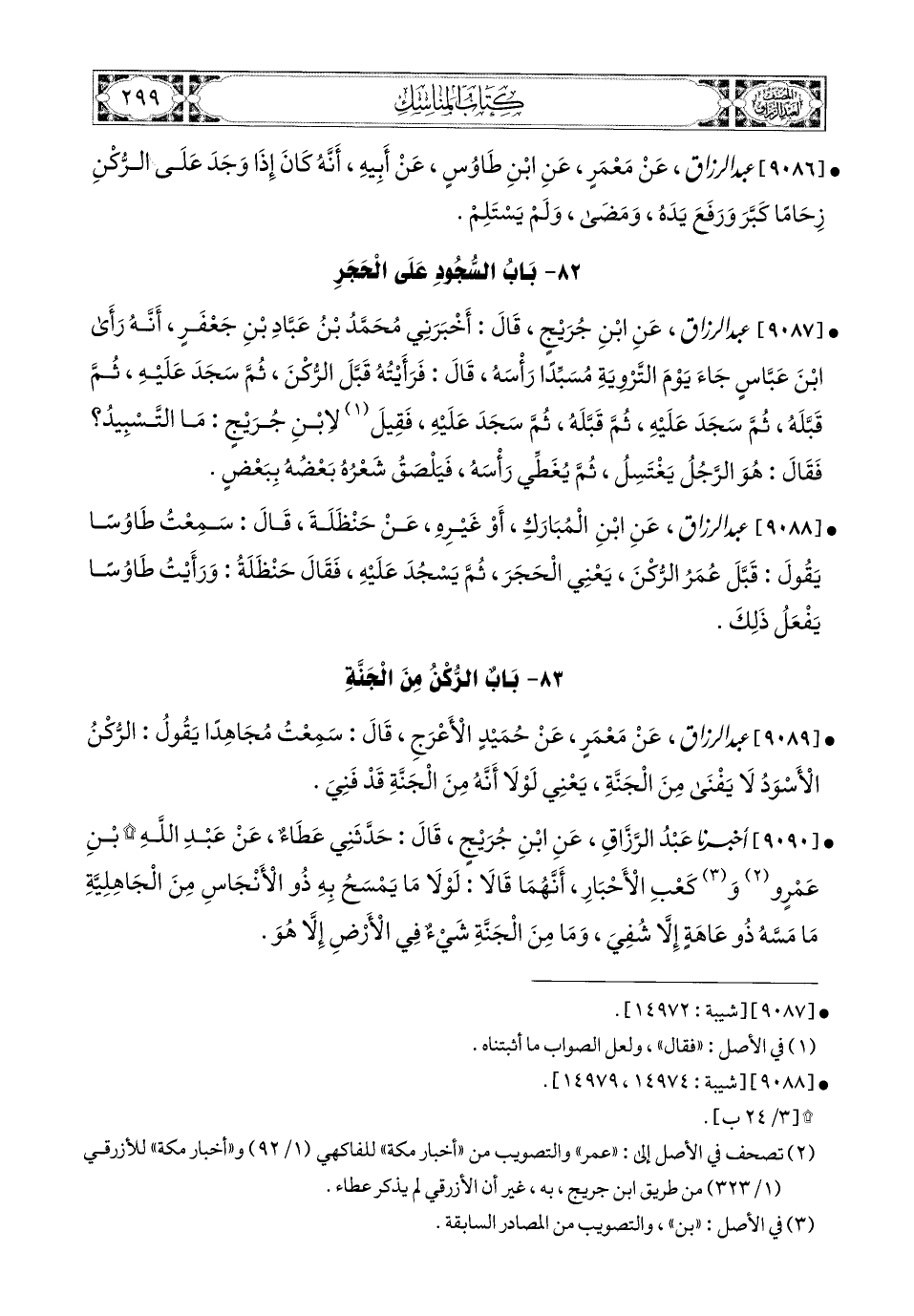 9088- عبد الرزاق، عَنِ ابْنِ المُبَارَكِ، أَوْ غَيْرِهِ، عَن حَنْظَلَةَ، قَالَ: سَمِعْتُ طَاوُوسًا يَقُولُ: قَبَّلَ عُمَرُ الرُّكْنَ يَعْنِي الْحَجَرَ، ثُمَّ يَسْجُدُ عَلَيْهِ، فَقَالَ حَنْظَلَةُ: وَرَأَيْتُ طَاوُوسًا يَفْعَلُ ذَلِكَ.